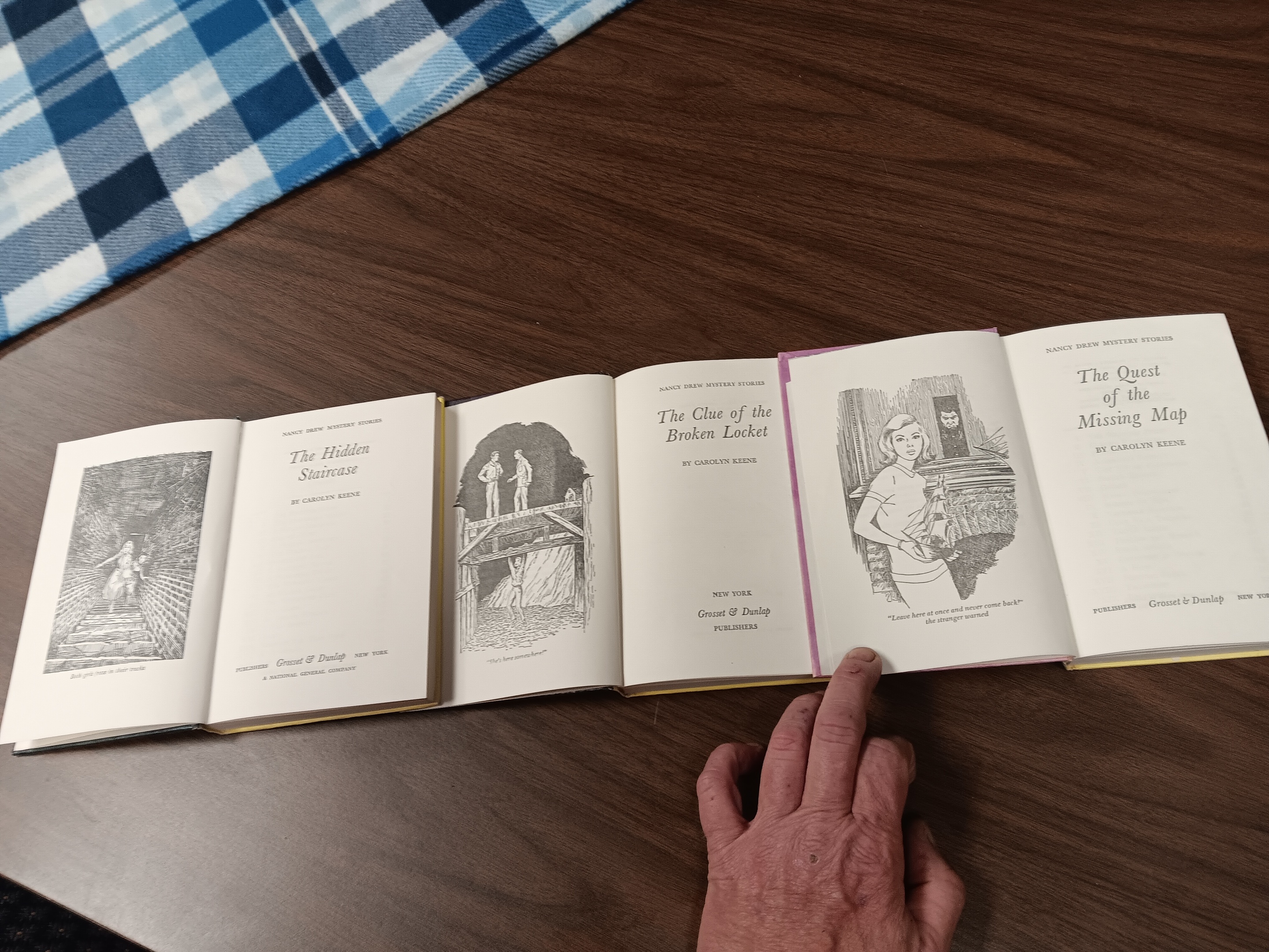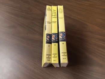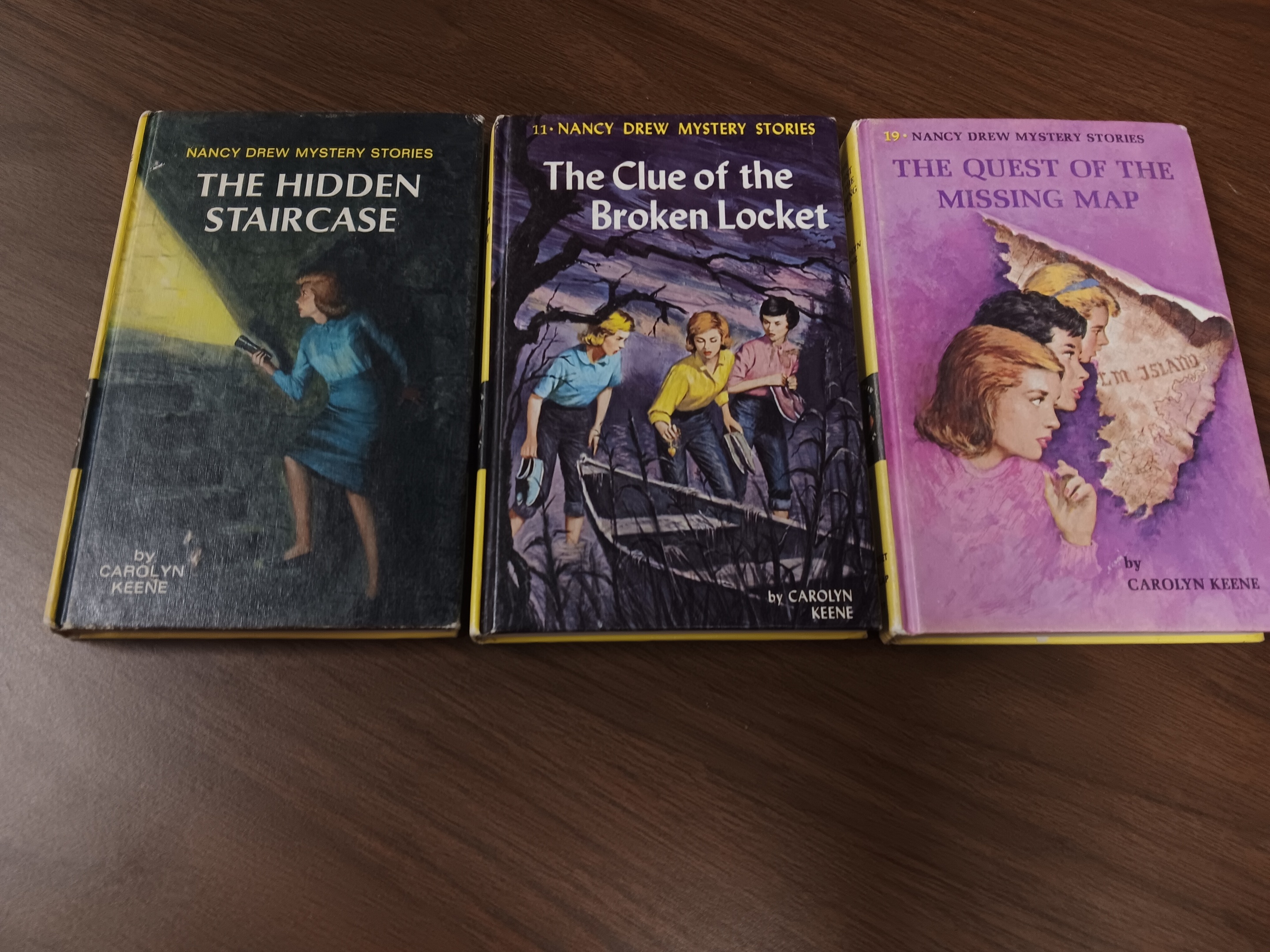 THE FIRST ONE IS "THE HIDDEN STAIRCASE", A PRINTING FROM 1959. THE SECOND BOOK, "THE CLUE OF THE BROKEN LOCKET", A PRINTING FROM 1965 AND FINALLY, "THE QUEST FOR THE MISSING MAP", A 1972 PRINTING.