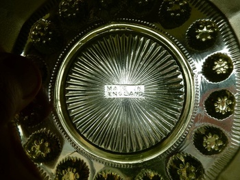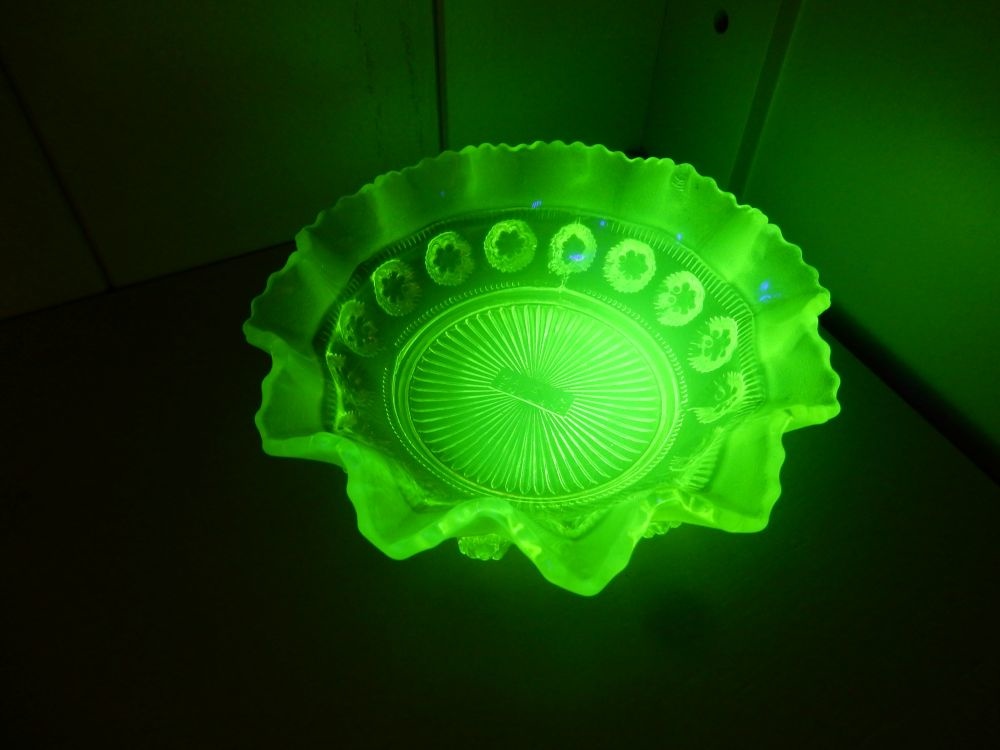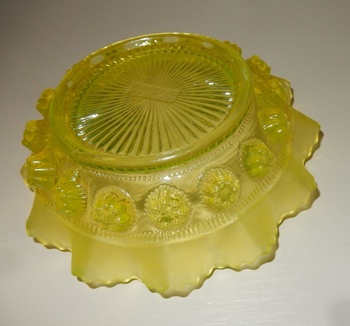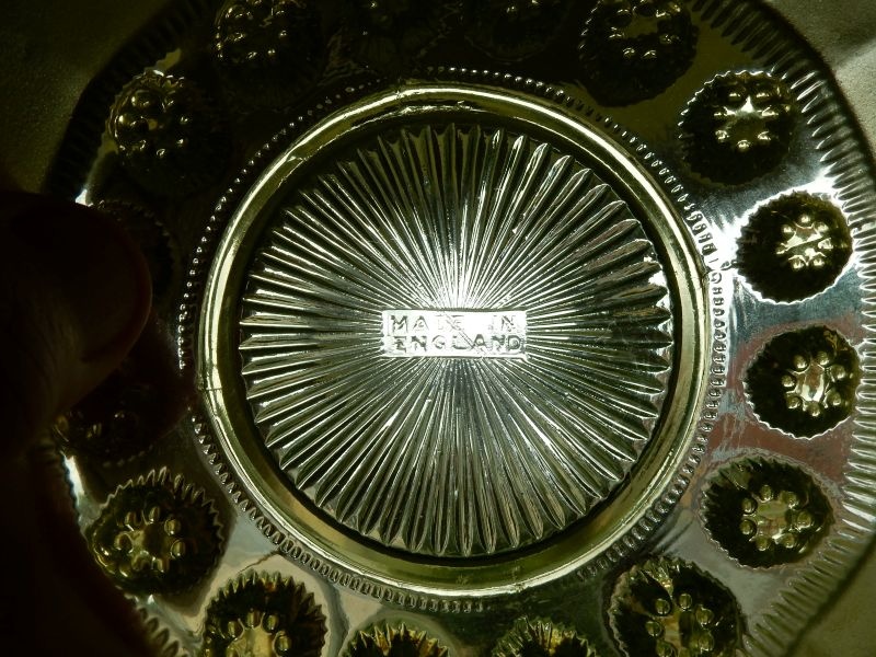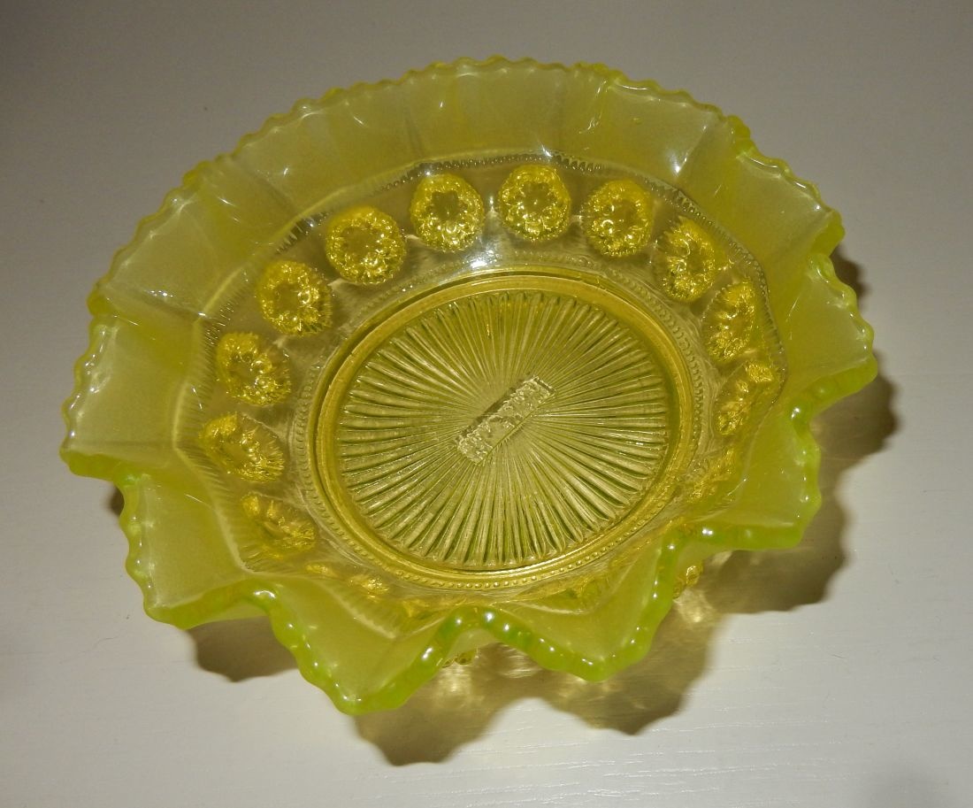 This is an unusual 5" dish in the pattern known as Blackberry Prunt. The dish is No.269/12 and the design was registered on 18/11/1908, No.533040. Davidson produced very little uranium glass around that time, this could be as early as 1908 but is more likely mid 1920's. The Made in England mark is a requirement introduced in 1887, again it's unusual to find it in a moulded rectangle.