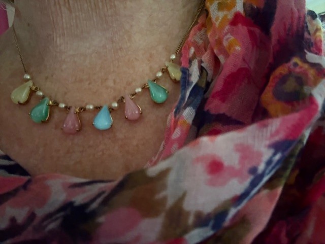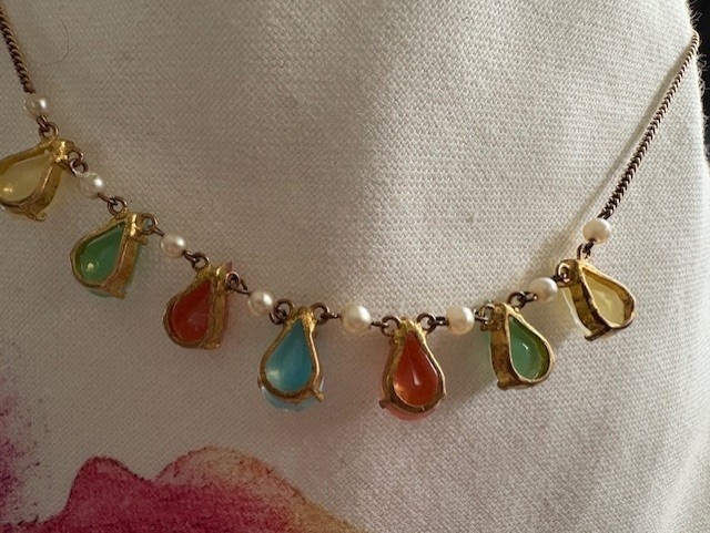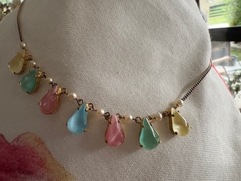 This fine, elegant vintage necklace with pear-shaped pastel coloured drops, gemstones or glass, is on what looks like a rose gold chain, with marking on the link hard to read, but appears to be 11 and maybe a letter.