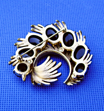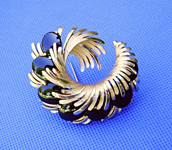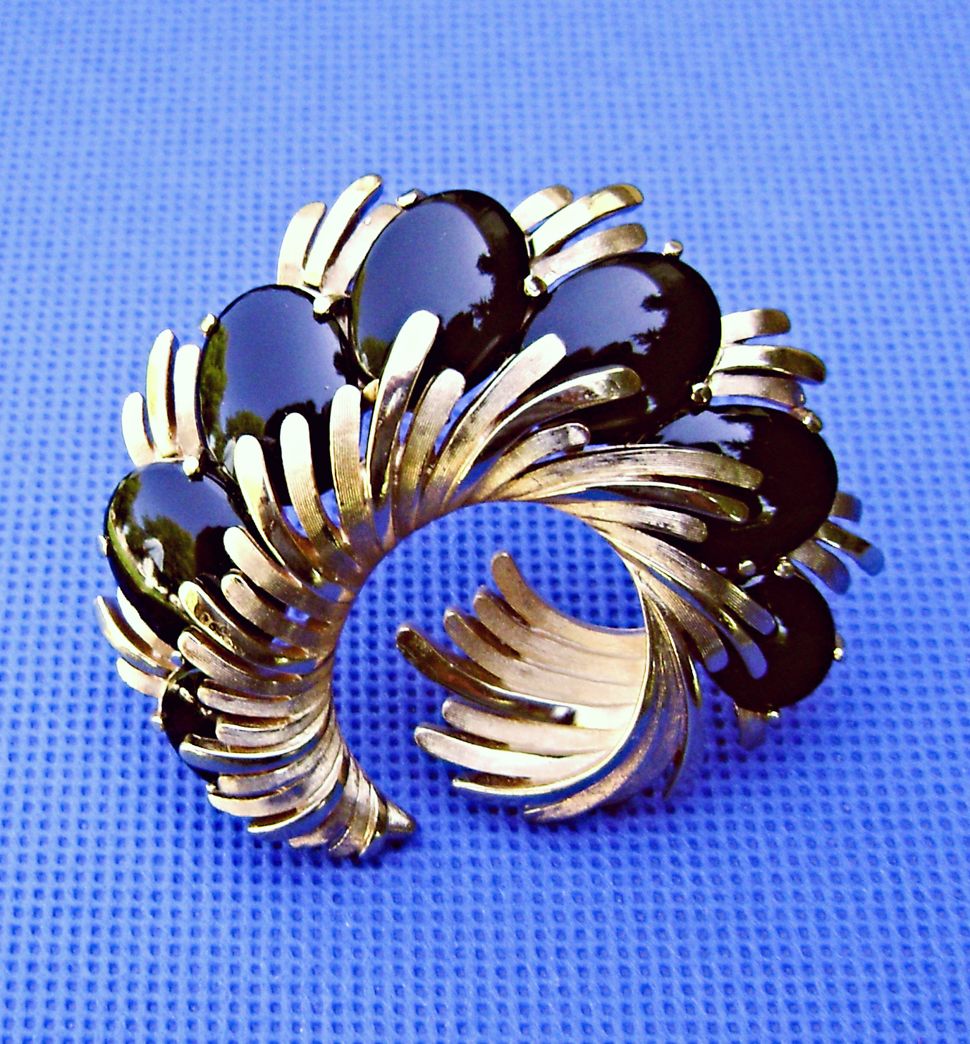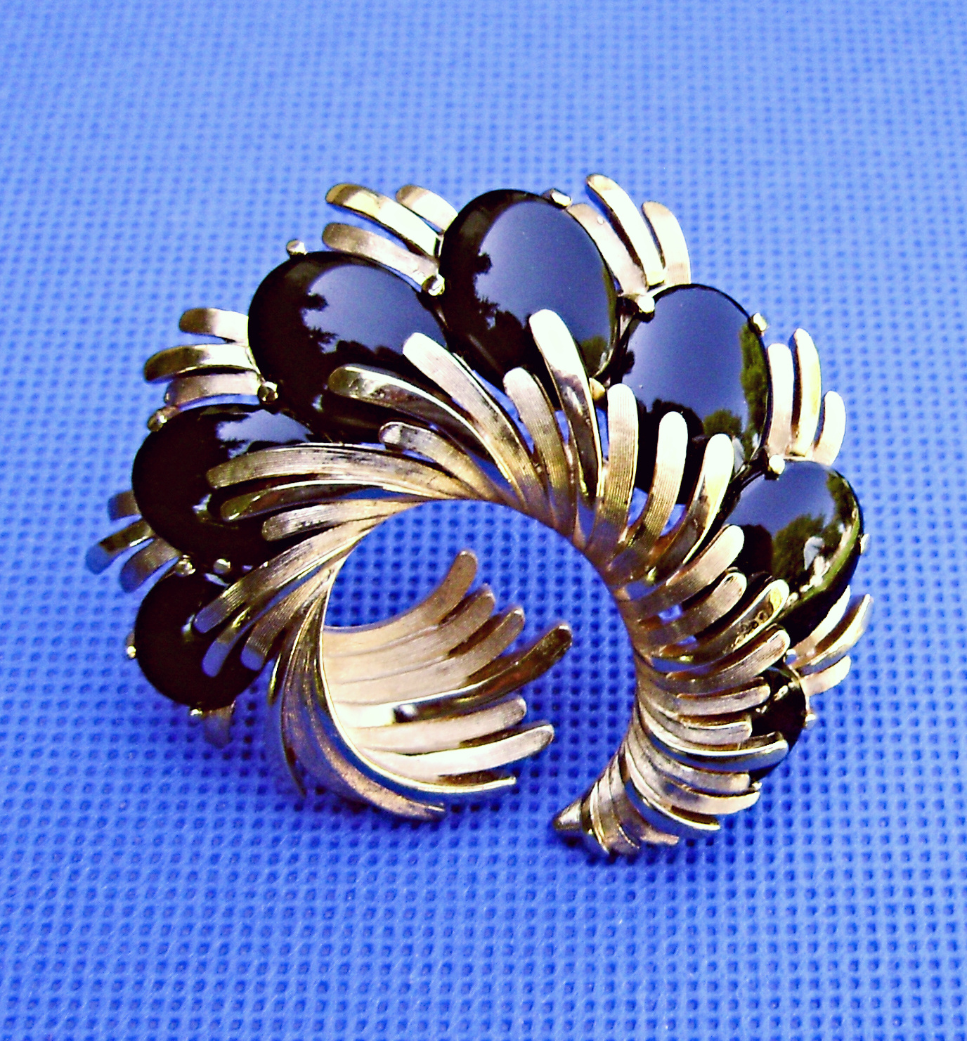 Vintage Crown Trifari brooch. With open back jet cabochons in a polished and brushed gold tone. Measures 2-1/4"