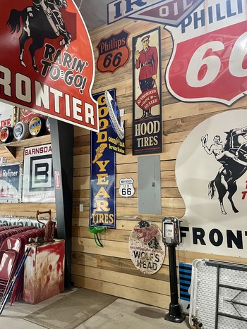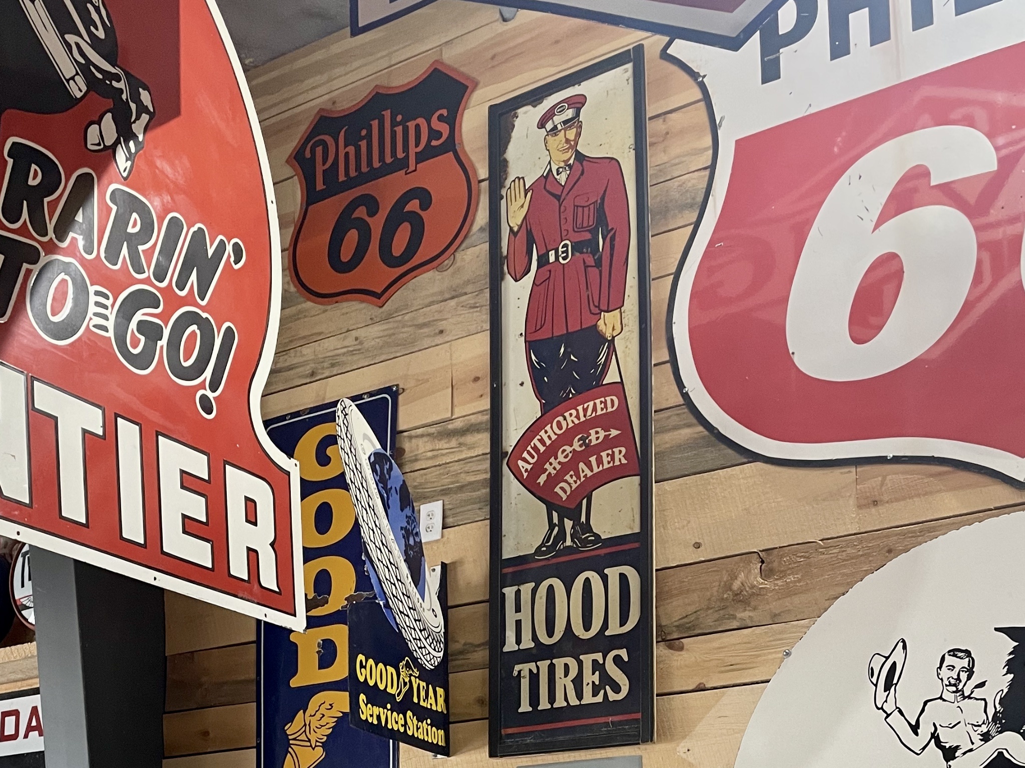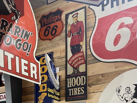 Got a call from a collector friend in Idaho a few weeks ago who told me he was selling his collection and has this old Hood Tire sign he thought I might want. Want? I’ll say! We just got it posted on the wall of the Sparks Museum today. Cool old sign! First one I’ve ever seen available.
