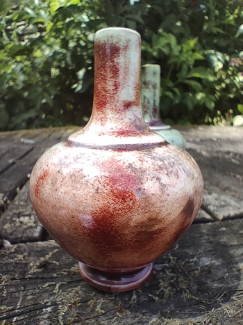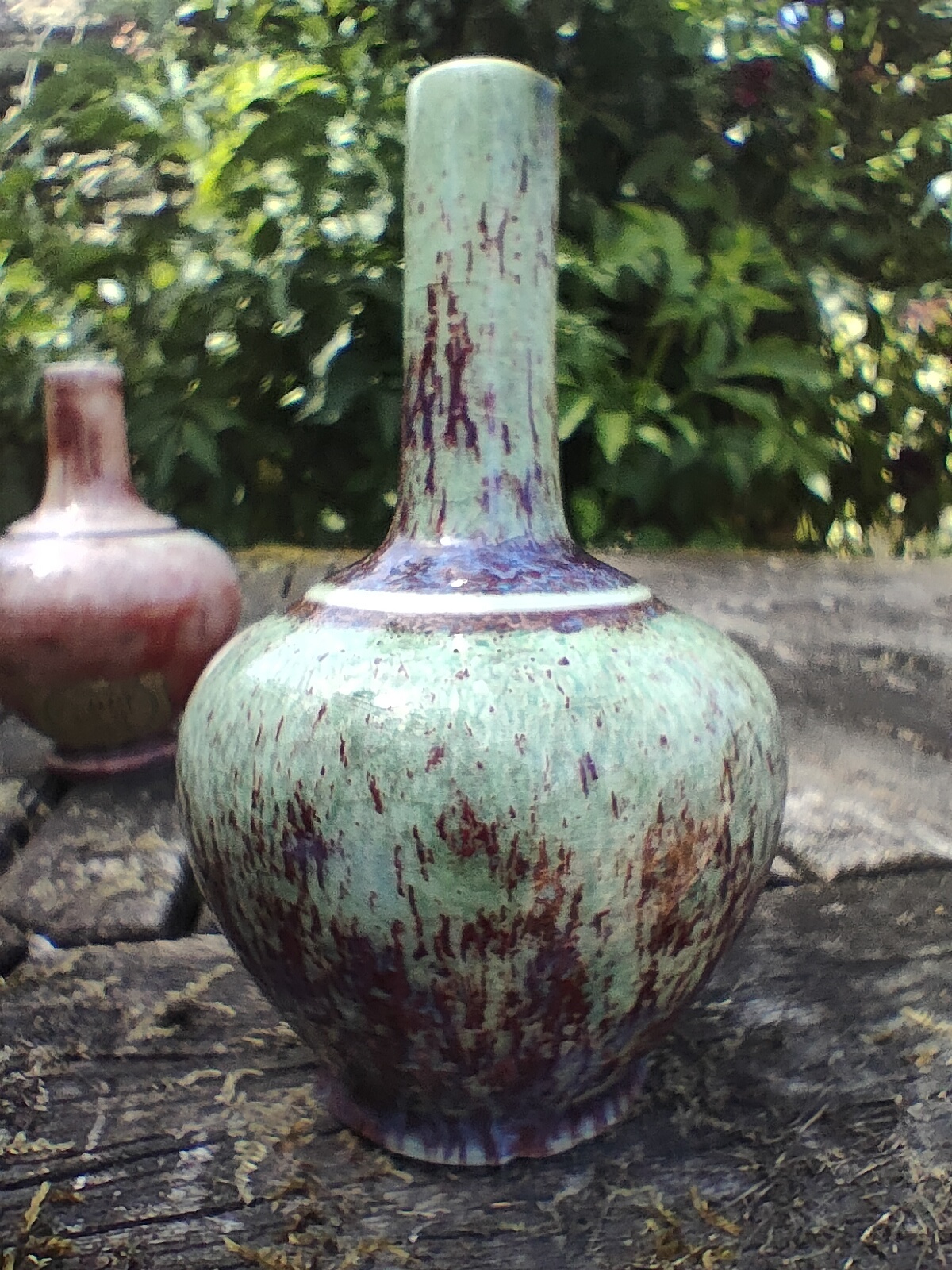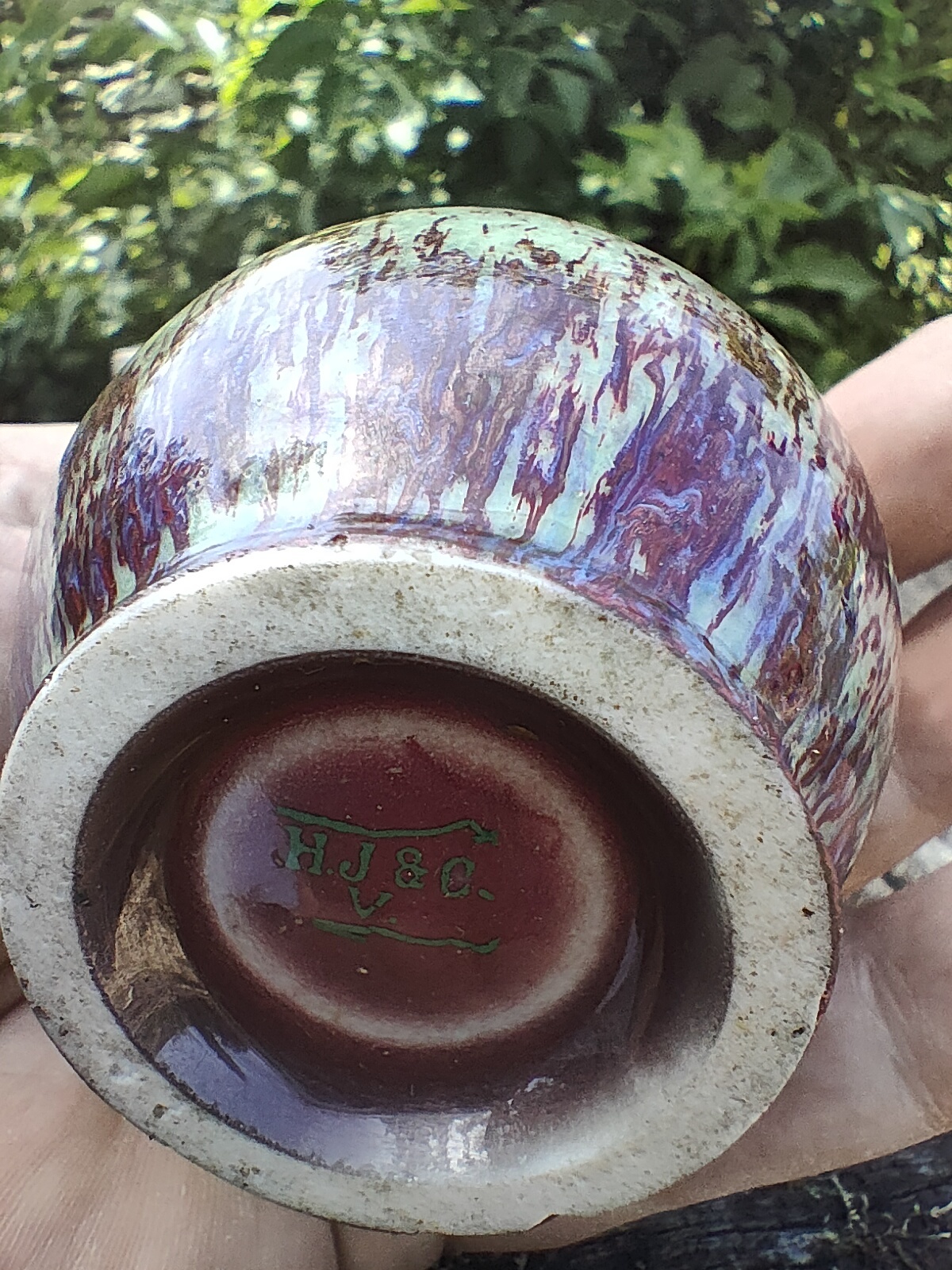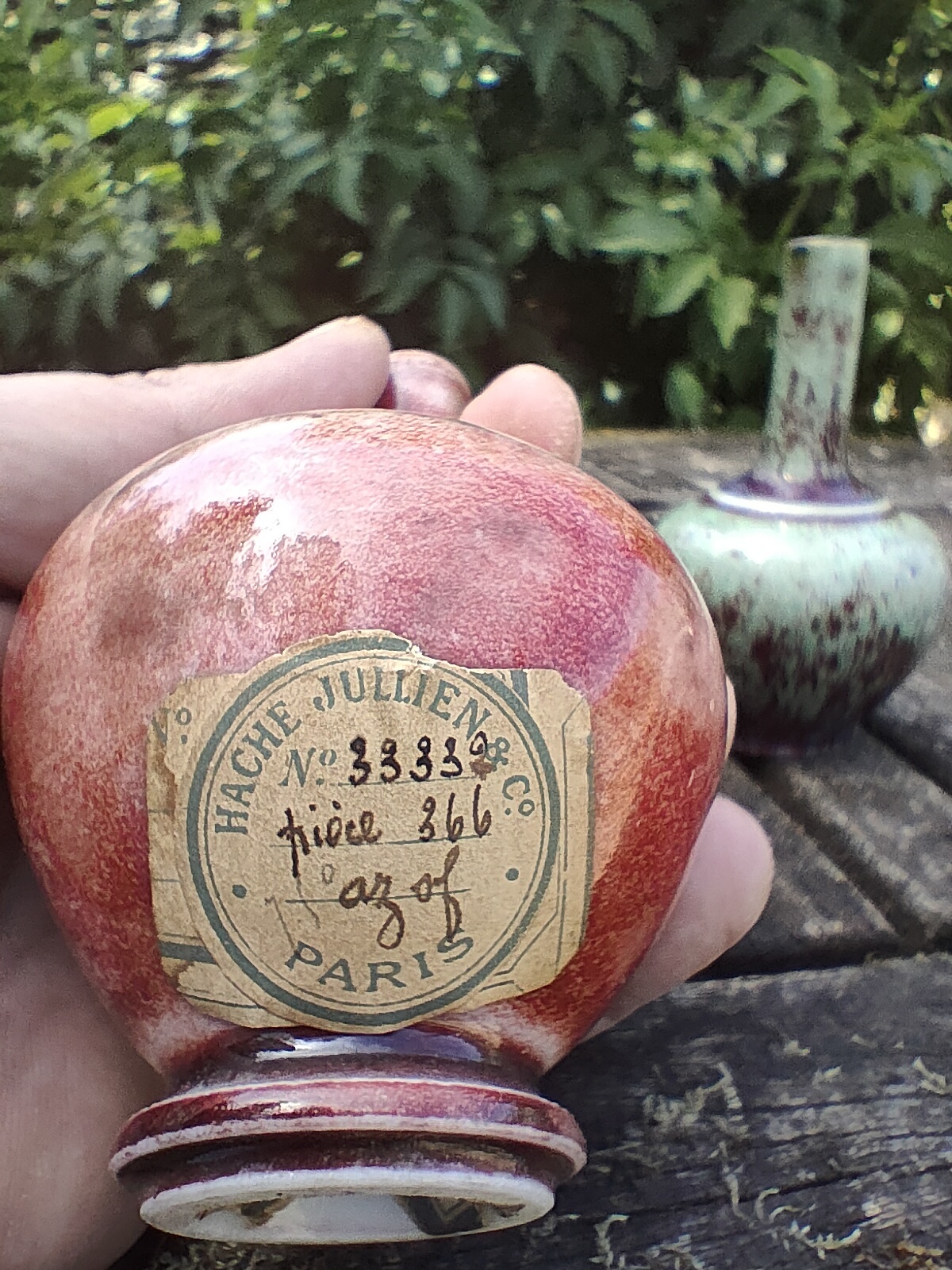 Hache Jullien porcelaine vase. This company from vierzon made alot of tableware. In 1889 they won a gold medal in the universal exposition Paris, with amongst other things samples of flambe and mule liver glazes. Not sure if this is them, but they look quite cool. Made between 1885 and 1903.