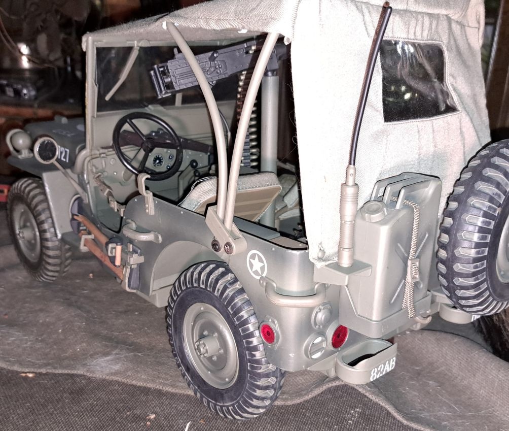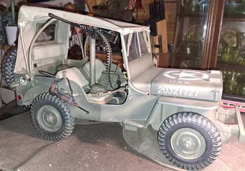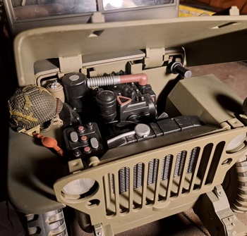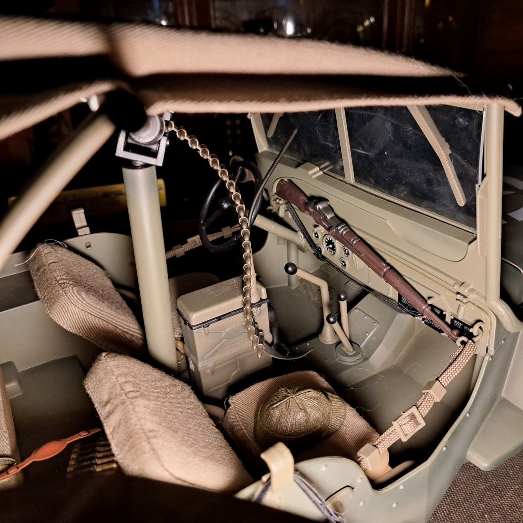 For some reason Ultimate Soldier aka 21st Century Toys did not call this a jeep but that is what it is. It is 1/6 scale which is the same as GI Joe. Now the thing about this Jeep is that it is the most detailed 1/6 scale vehicle I have seen. The seats are cloth, detailed engine compartment and it has a canvass cover. The cover is retractable, but I have other jeeps with no cover. There is also a detailed dashboard with with an M1 Garand mounted on it. Lots of other fun details too. I may replace the .50 with a .30 as it would fit better with the to up.