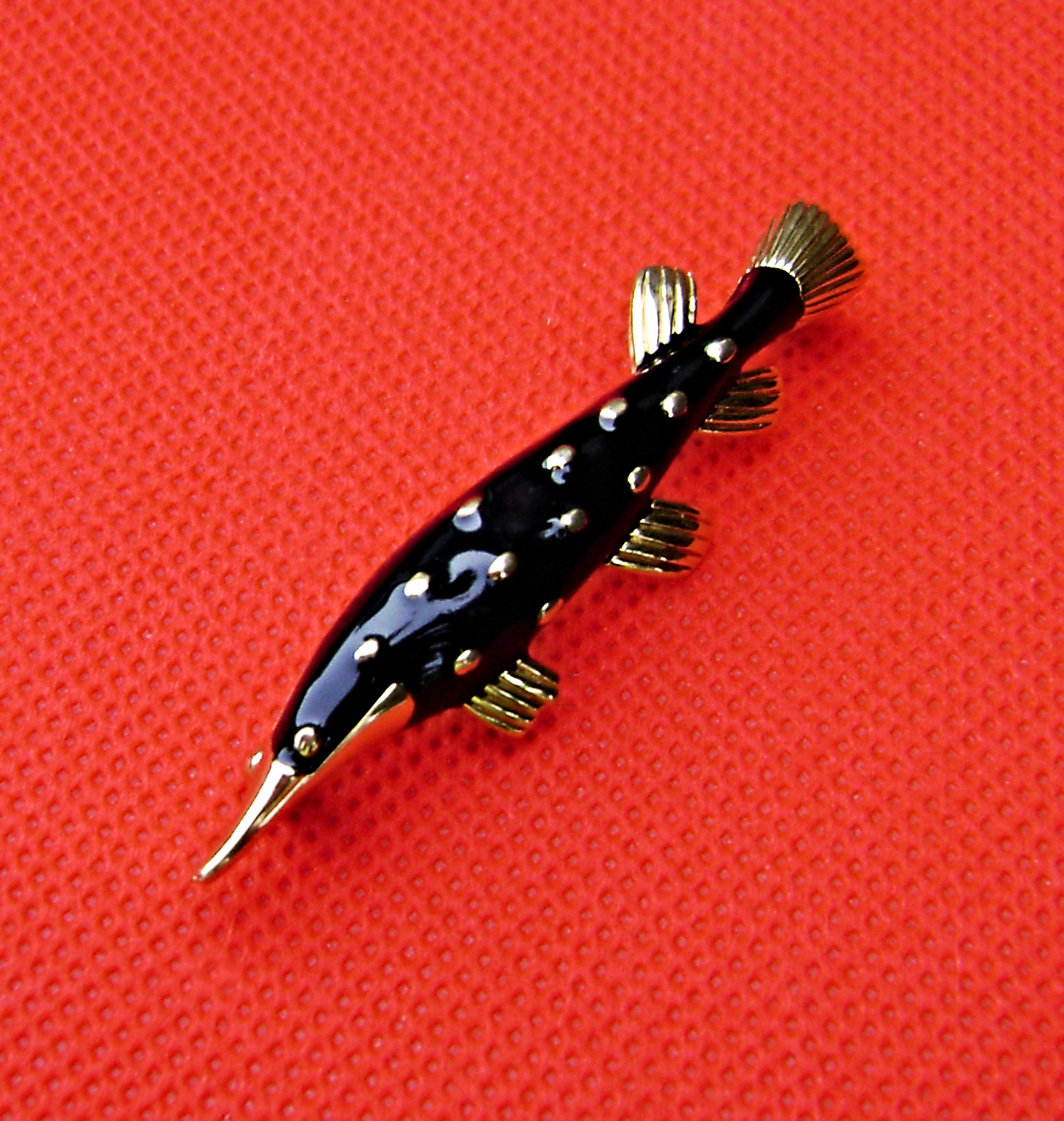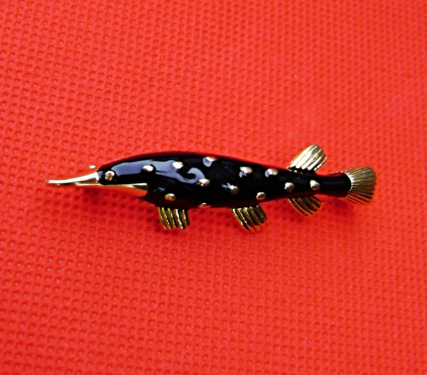 Crown Trifari Gar Brooch. In black enamel, with gold tone eye, scales, and fins. From the 1970's. 2-1/4"