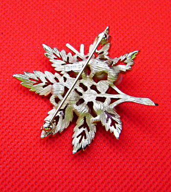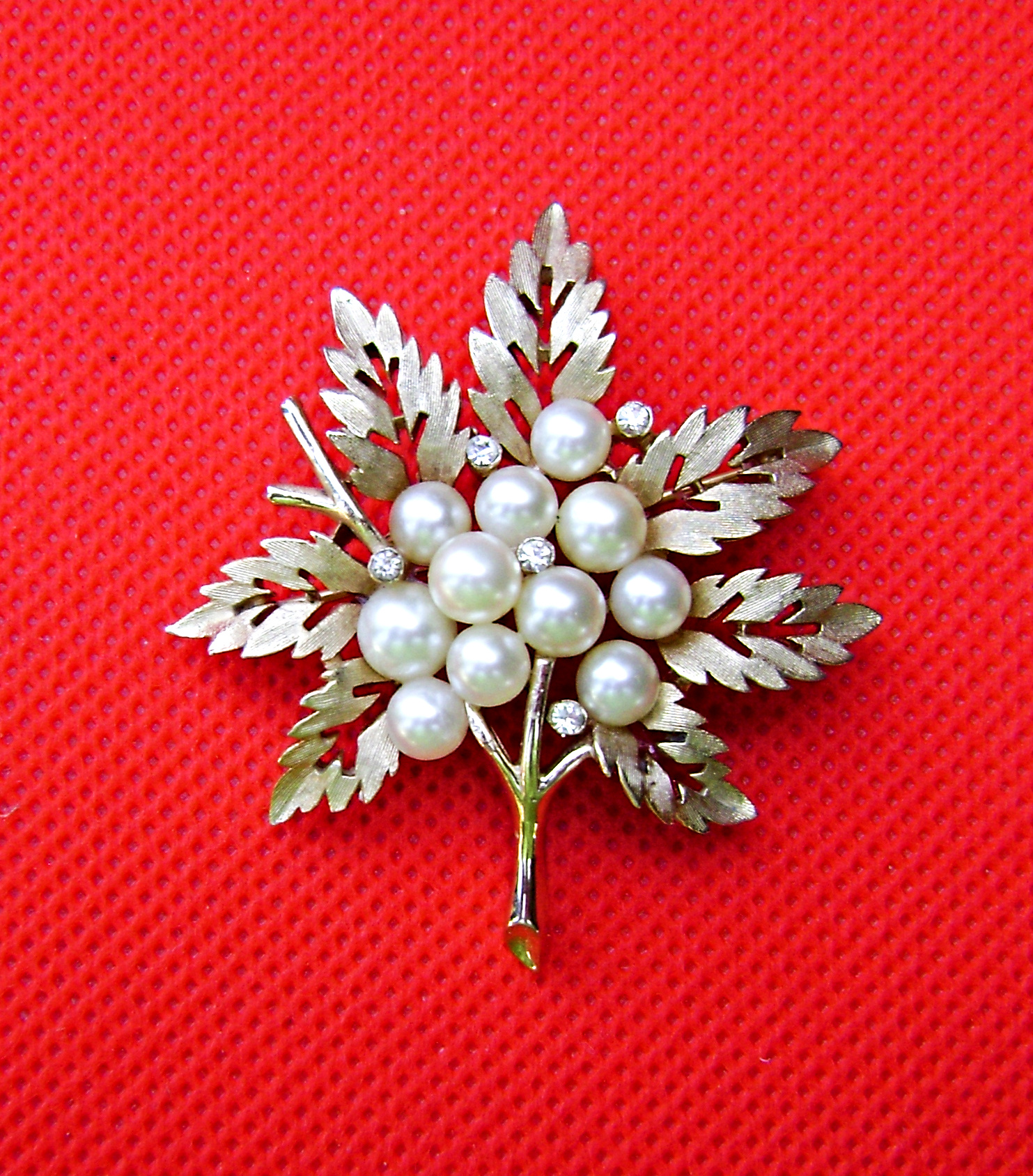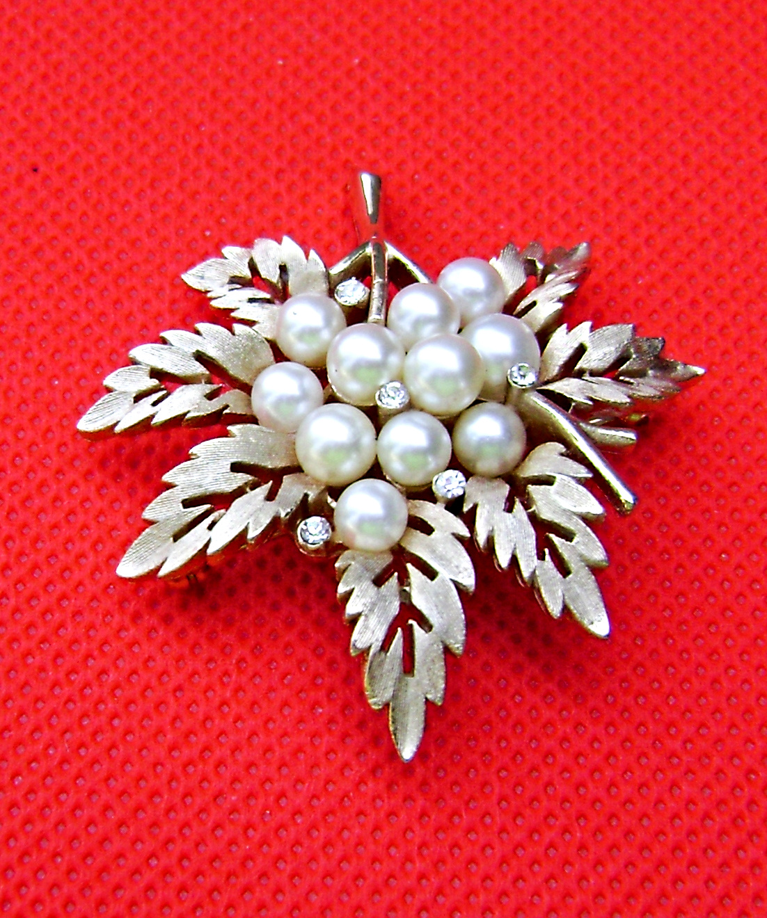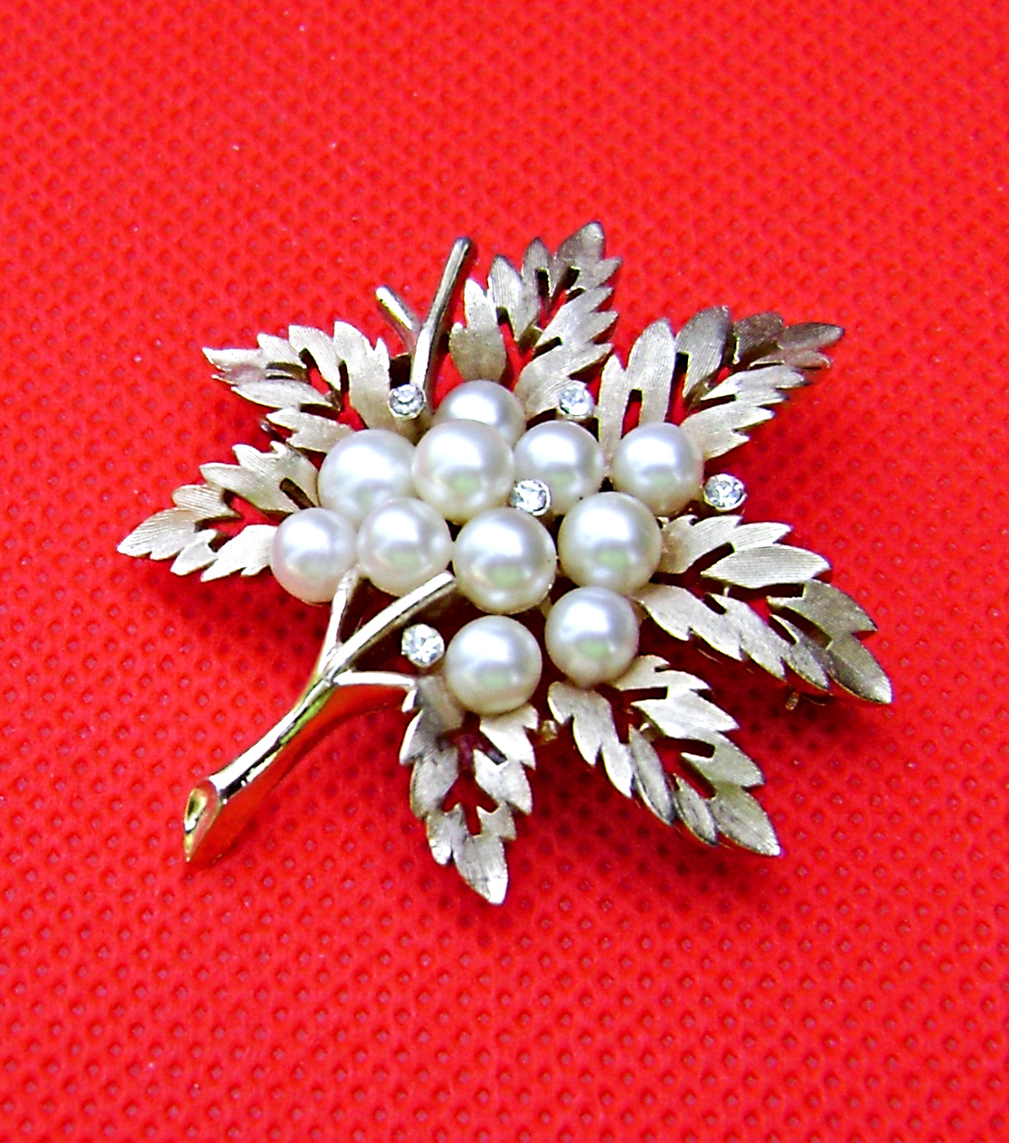 Crown Trifari Leaf Brooch. Sprig of simulated pearls and crystal bezel set rhinestones. Gold tone. 2" tall. Gems of the Sea series. 1958