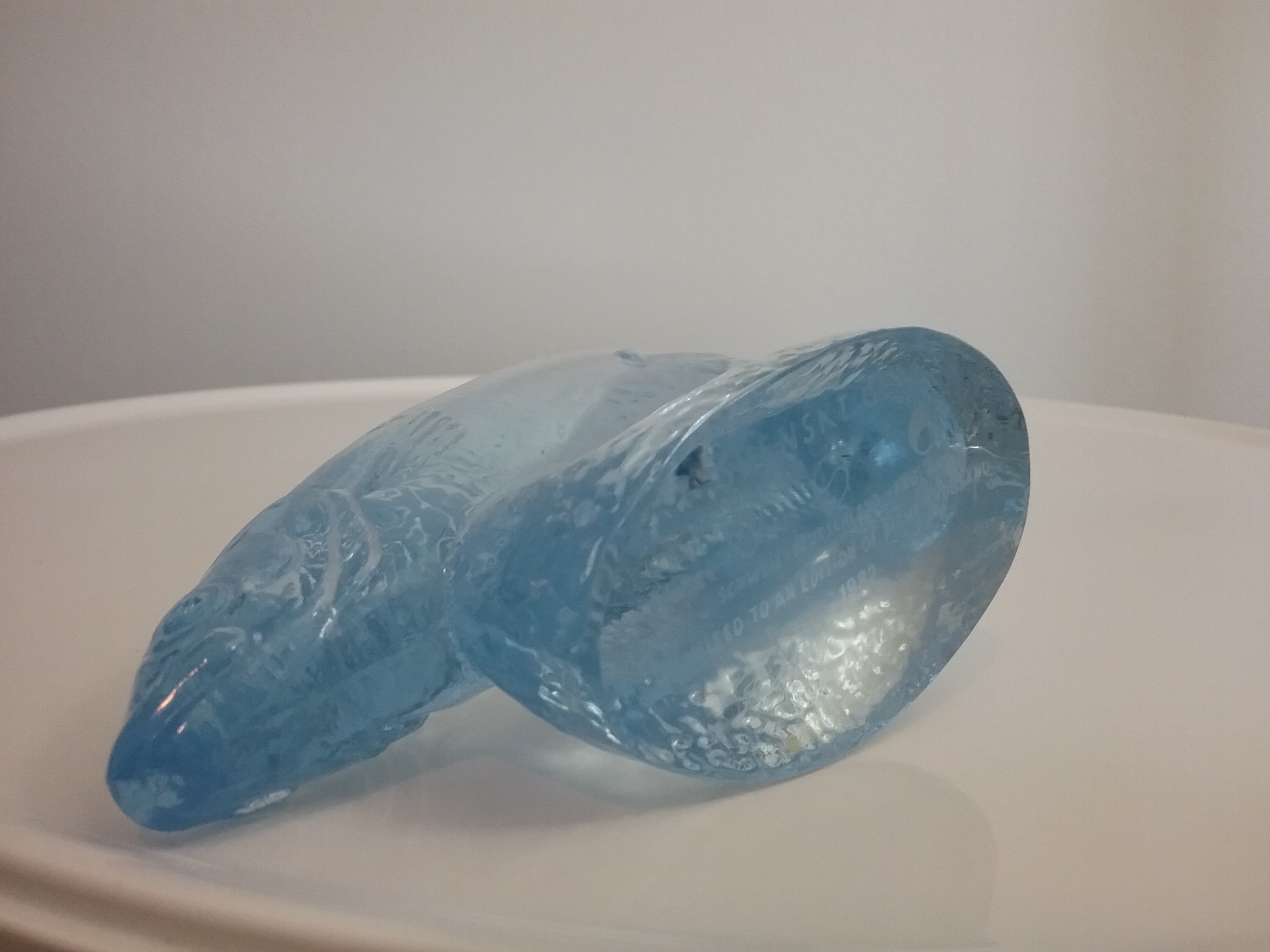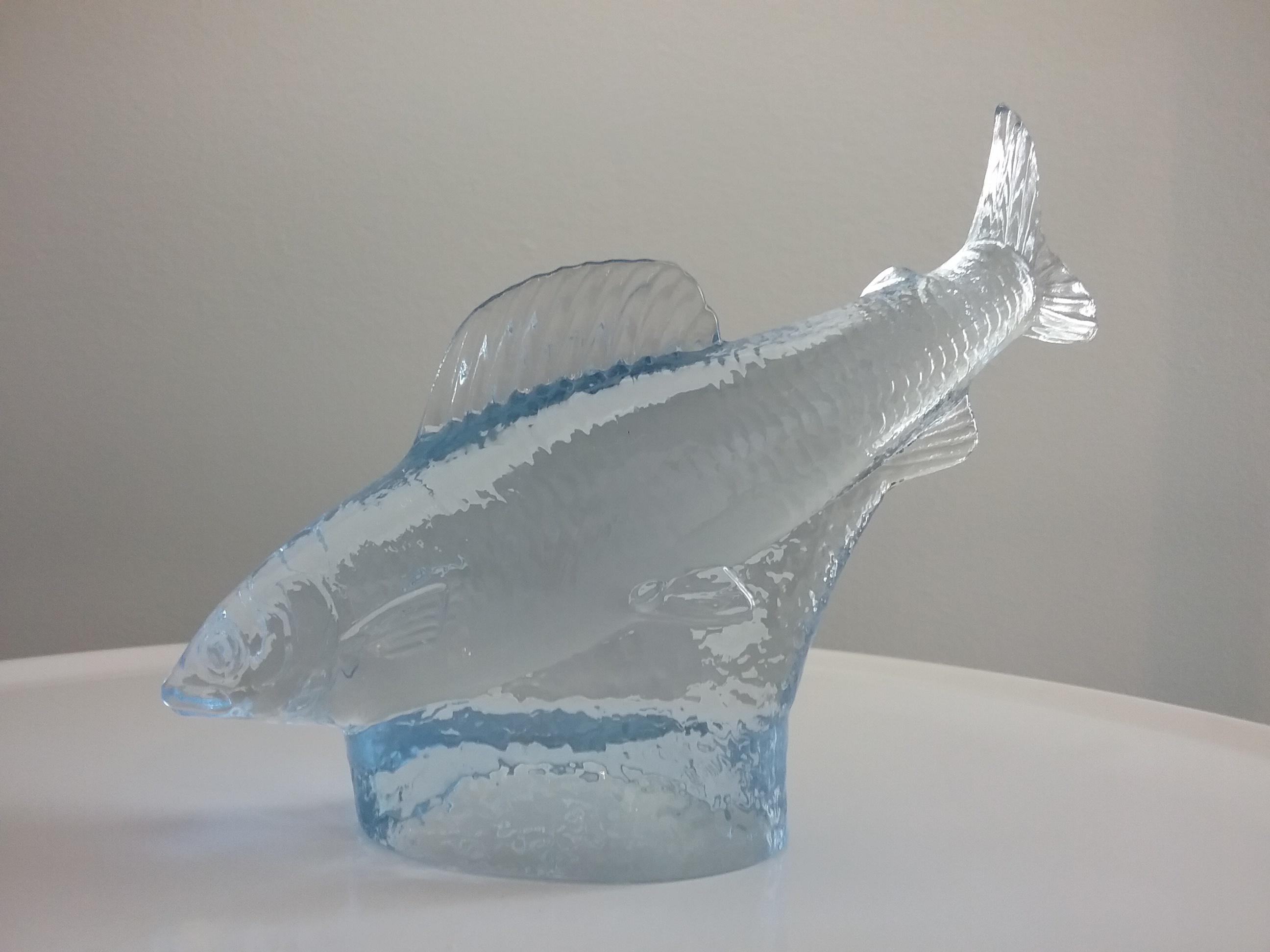 Here is an 8"W light blue glass fish sitting atop a textured 1"H rounded base, designed by glassmaker Paul Hoff as part of his endangered animal series for the World Wildlife Fund made by Kosta Boda Glass in 1982 in a limited edition of 8000