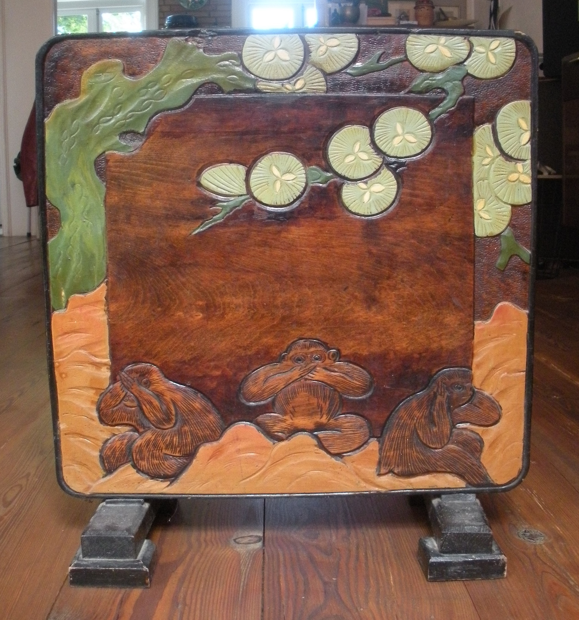 This table top has the typical Japanese design of The "three wise monkeys" representing the proverb "see no evil, hear no evil, speak no evil." in combination with Bonzai branches of a pine tree. It is rare that this beautiful piece of wood carving is lacquered. I have not come across that before.