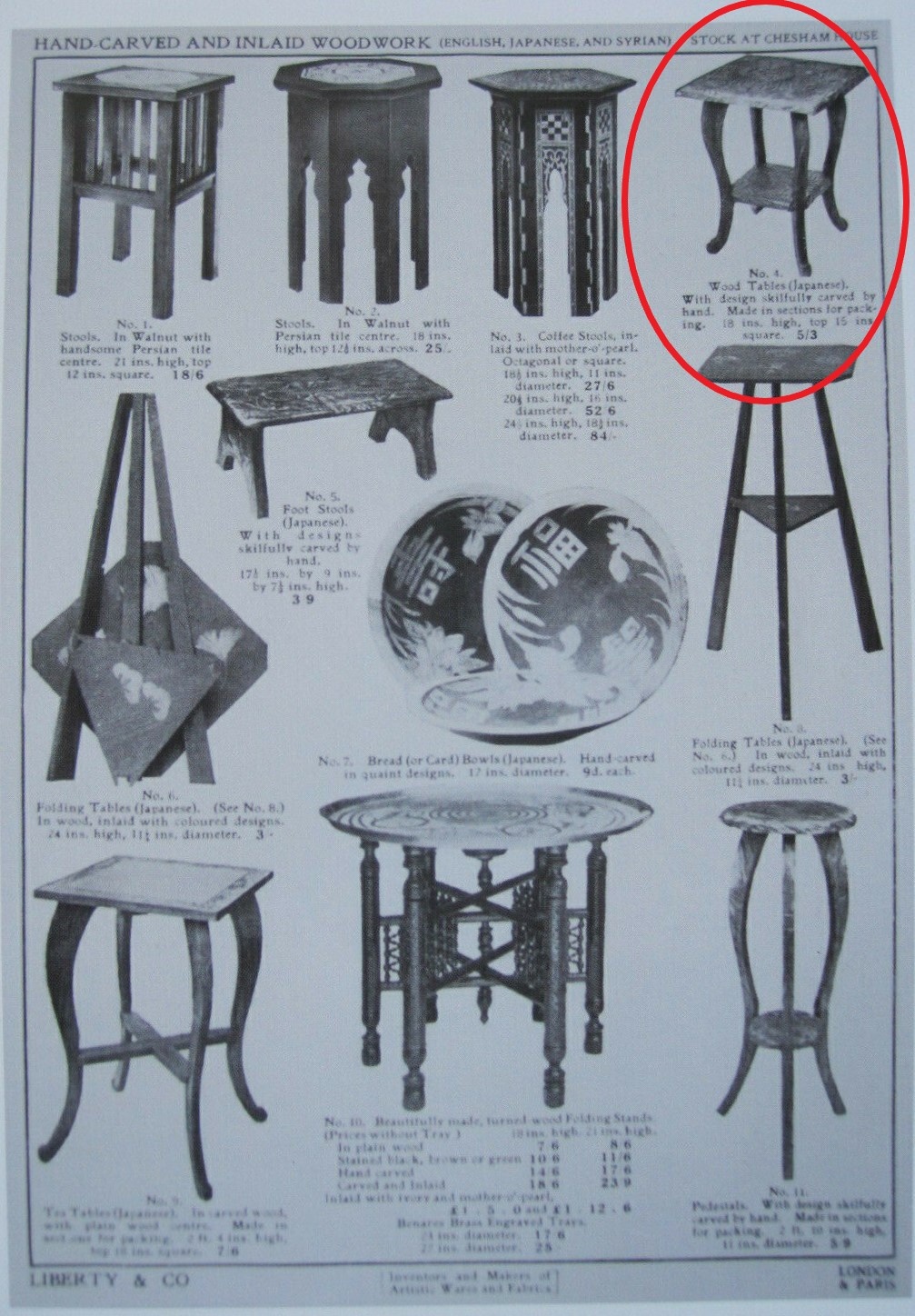 The various parts of the table were numbered (see photo) and packed unassembled which made transport from Japan easier. At the "Eastern Bazaar" in Liberty's Regent Street headquarters in London, the parts were collected and assembled before they were sold in the store.