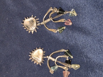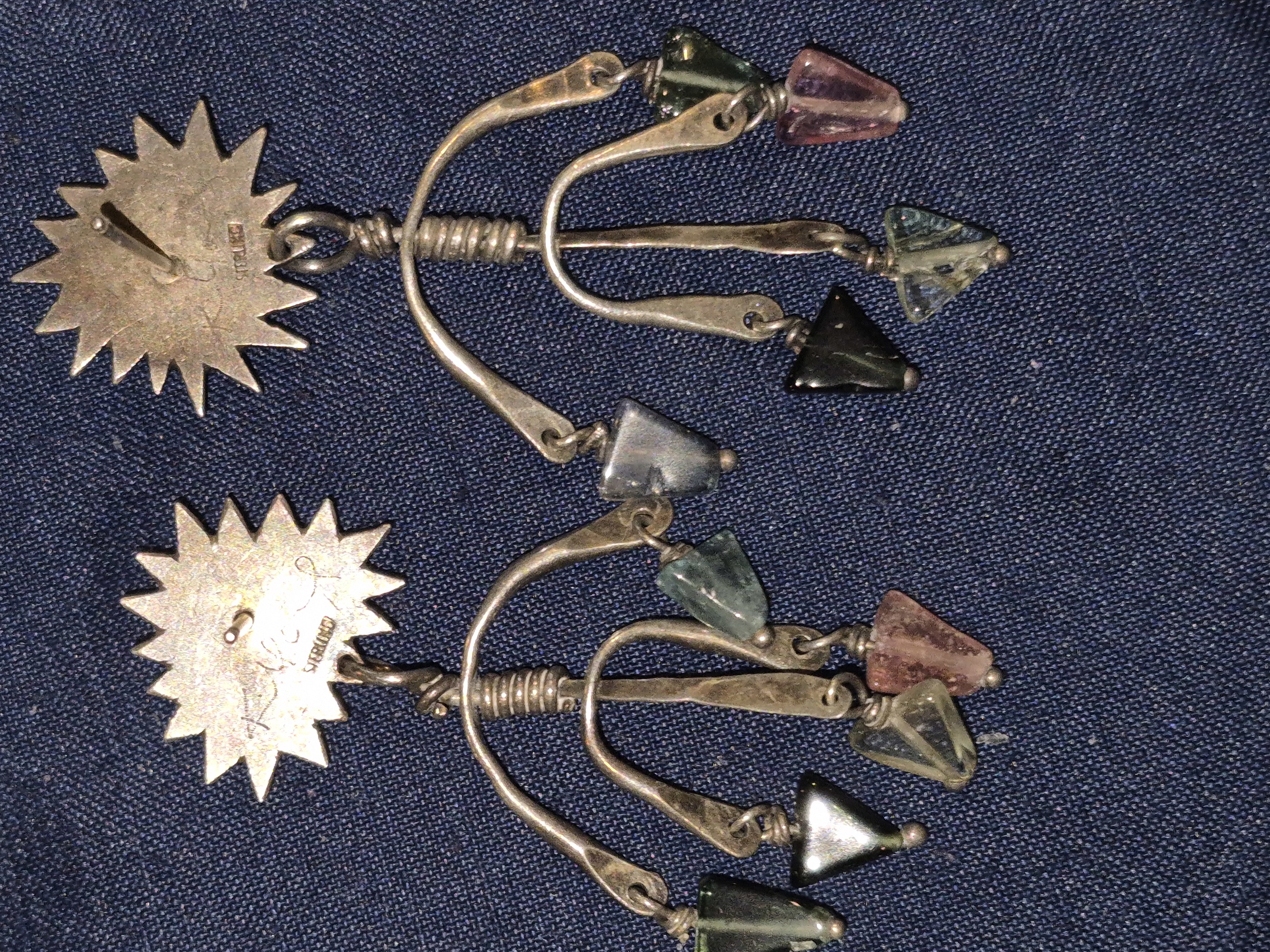 Gorgeous silver dangle ornate earrings with natural stones script signature on back any help would be appreciated.