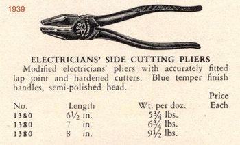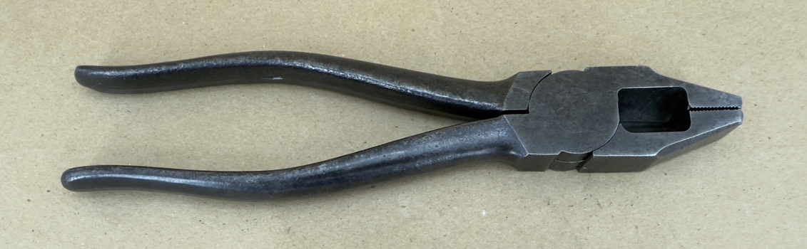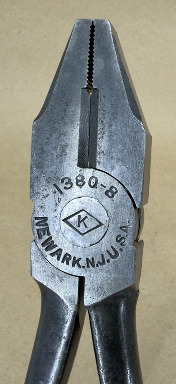 Cleaned and restored pair of late-30’s Kraeuter & Co. “K-Diamond” No. 1380-8 electricians’ (most commonly referred to as “lineman’s") side-cutting pliers. While earlier Kraeuter plier handles were often adorned with patterned outer designs and “Kraeuter USA” on the inside, this one is plain handled and only has a single, small, forged diamond in the underside of one handle.