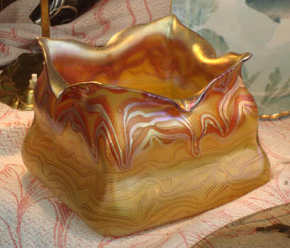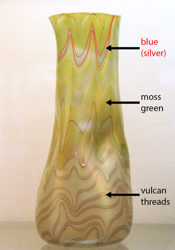 Fig. 2: Vase from the Passau Glass Museum (inv. no. Hö 67 970), used as reference for phenomenon Gre 2/679 in Loetz 1989 and Loetz 2003 (B 144, p. 307), but in Gre 1/728 with moss green, blue & vulcan threads (photo by author),