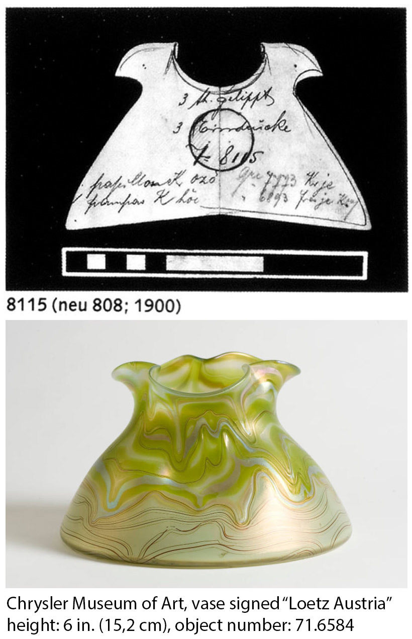 Wer in den beiden Lötz-Publikationen von 1989 (Lötz Böhmisches Glas 1880–1940) und 2003 nach Beispielen für das Phänomen Genre 1/728 sucht, wird nicht fündig, jedenfalls nicht direkt. Also beginnt die Suche in den Eintragungen auf Musterschnitten und in den Fakturbüchern in selbigen Publikationen und in der großen Ausgabe der Papiermusterschnitte der Serie II von 2011. Und es gibt sie. Der älteste Schnitt 8115 stammt noch aus der Serie I von 1899, neu aufgenommen als Nummer 808 im Jahr 1900. Auf der größten der drei Versionen mit 14 cm (8115/5 ½") befindet sich der Eintrag „1 Phänomen Gre 1/728 Eilig!“. Diese einfach zu identifizierende dreilippige Form ist in vielen Dekorvarianten hergestellt worden, darunter auch in bekannten Phänomen Genres wie Gre 6893, Gre 7773 und Gre 1/64. Vor Jahren ist mir die formidentische Vase auf Seite 204 im Buch „Art Glass Nouveau“ von Ray & Lee Grover aus dem Jahr 1978 aufgefallen. Die Vase aus dem Chrysler Art Museum ist mit einem Phänomendekor abgebildet, das sich aus schmalen Bändern mit grünlichen, verbunden mit blau schimmernden Silberfäden sowie dünnen Vulcanfäden zusammensetzt. Die Vase ist eindeutig in ihrer Form, allerdings etwas größer als der Schnitt mit 5 ½ Zoll. Das lässt zwei Interpretationen zu: die Vase ist etwas größer ausgeführt worden, wahrscheinlicher aber gab es neben den 3 ½, 4 ½ und 5 ½ auch einen Schnitt mit 6 ½ Zoll, der nicht überliefert ist. Die Vase aus dem Buch der Grovers ist heute auch auf der Museums-Webseite zu finden (Bild 1). Der Verdacht, hier ein Beispiel für das Genre 1/728 entdeckt zu haben, keimte zwar auf, gelangte aber nicht zur Blüte. Erst kürzlich bin ich wieder auf diesen Dekor gestoßen (Bild 3) und auf Spurensuche gegangen. Gläser mit diesem Dekor sind gar nicht so selten und es gibt den Dekor in zwei Farbversionen, jeweils mit candia und thea als Grundglas. Die Bezeichnungen von Lötz lauten „candia/thea Phänomen Gre. 1/728 mit moosgrün, blau & vulcan Fäden“ und „thea/candia Phänomen mit rot Gre. 1/728“, kurz moosgrün und rot (vgl. u.a. Eintragungen auf Schnitten II-115/I und II-847). Da die Fäden sehr dünn auf dem Glas appliziert sind, erscheinen die Moosgrün-Fäden ziemlich hell, auf candia Grund sogar gelblichgrün. Doch worauf verweist die Angabe „blau“ in der Dekorbezeichnung? Dem Augenschein nach sind die silberhaltigen Fäden bläulich irisiert, ein Farbenspiel, das auch im Phänomen Genre 1/104 zu finden ist. Es gibt nur sieben Musterschnitt- bzw. Fakturbucheintragungen, die den Gre 1/728 nennen, dafür deutlich mehr Gläser mit dem Dekor. Das ist nicht ungewöhnlich, da nur sehr wenige Schnitte aus den Jahren 1901 bis 1903, also aus der Herstellungszeit des Dekors überliefert sind.