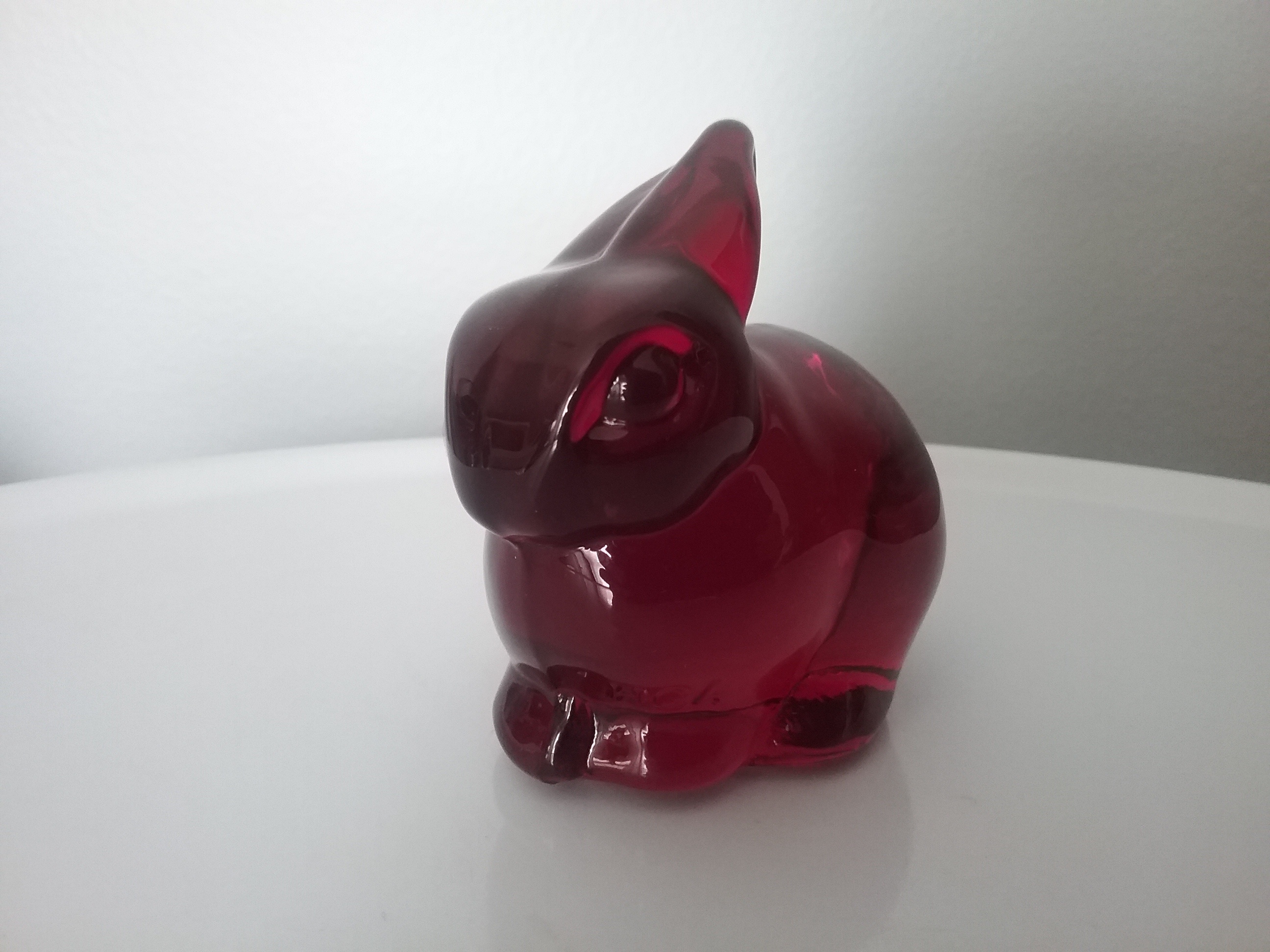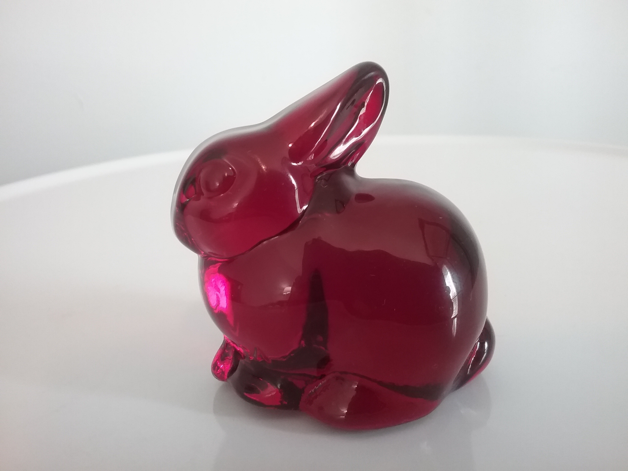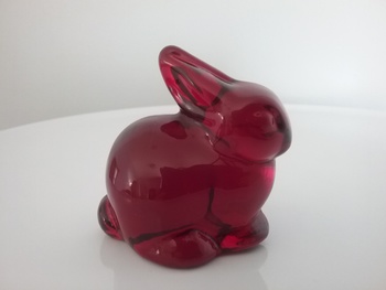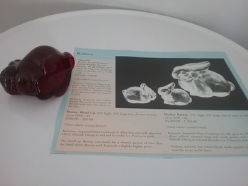 Here is an approx 3"W red glass rabbit that was the Heisey Bunny, Head Up originally made in the late 1940s, reissued in the early 90s by Dalzell Viking for the HCA (Heisey Collectors of America), with raised imprint above the front leg. Excerpt from book Glass Animals by Spencer