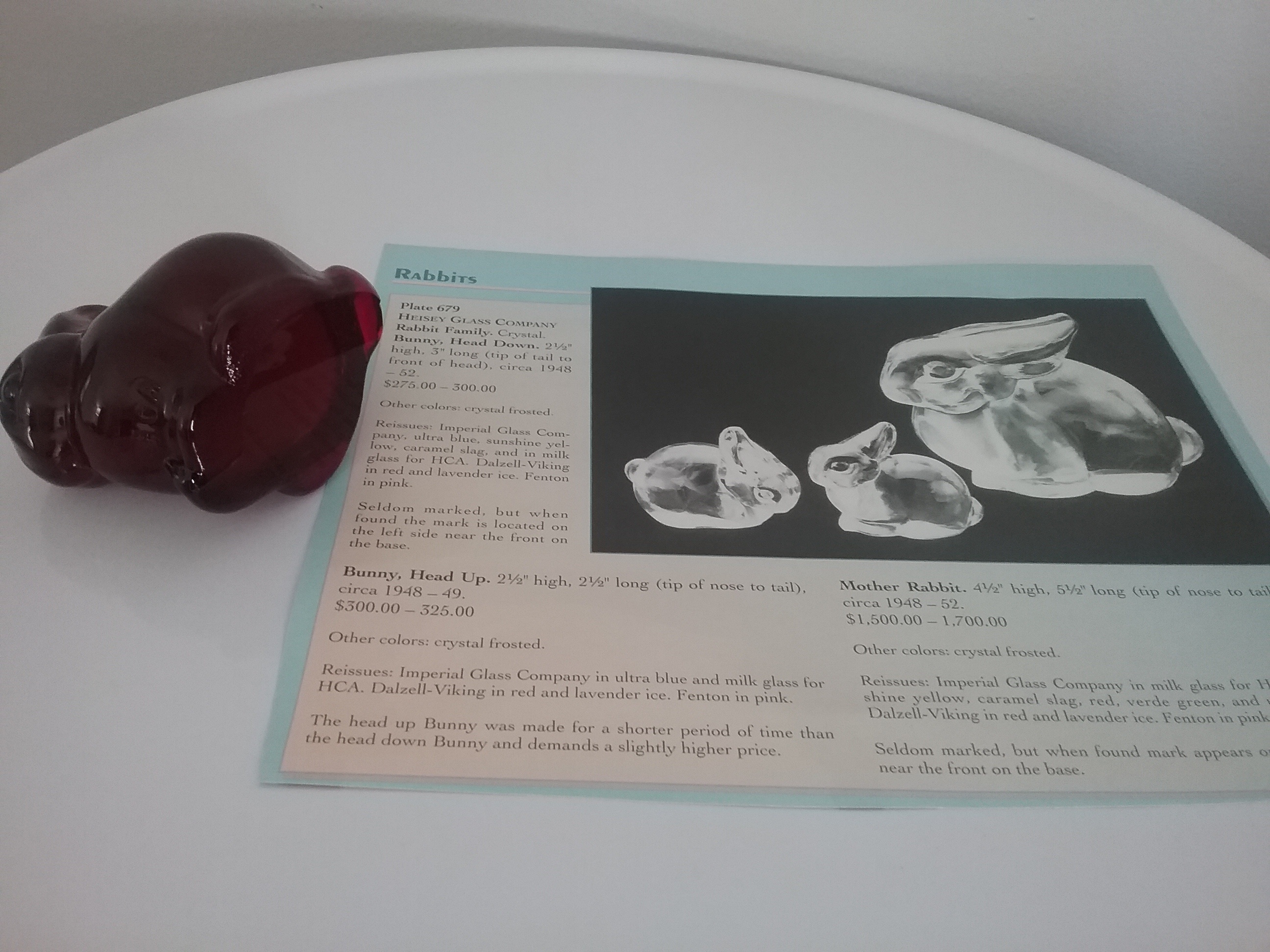 Phil this was a nice find in the red glass, I already have the larger mama bunny in pink, so this baby will kind of complement it. I did NOT pay the whopping price in the book excerpt, perhaps because of its smaller size it was affordable (not cheap tho). Thank you for your terrific comment