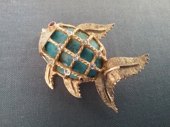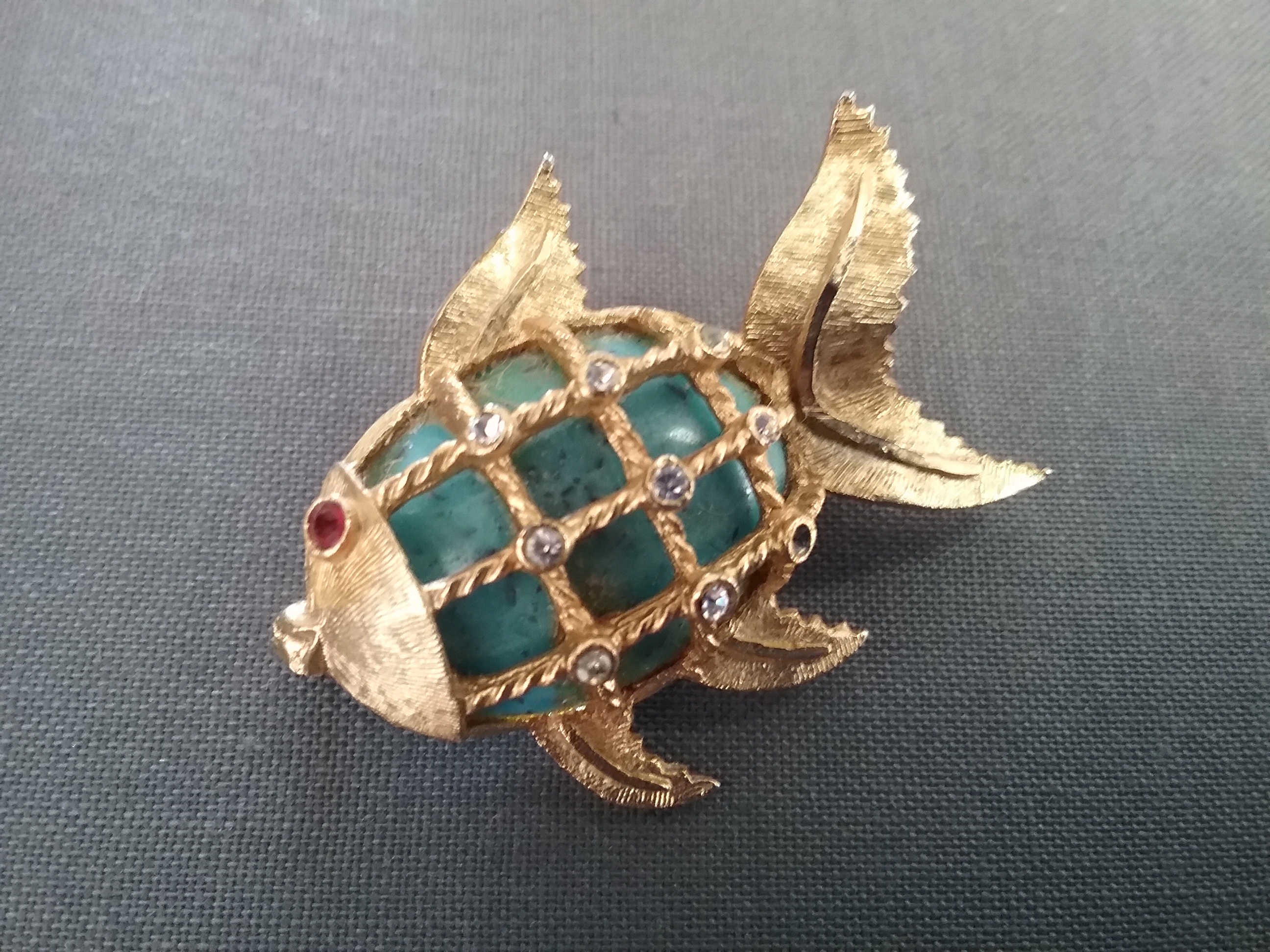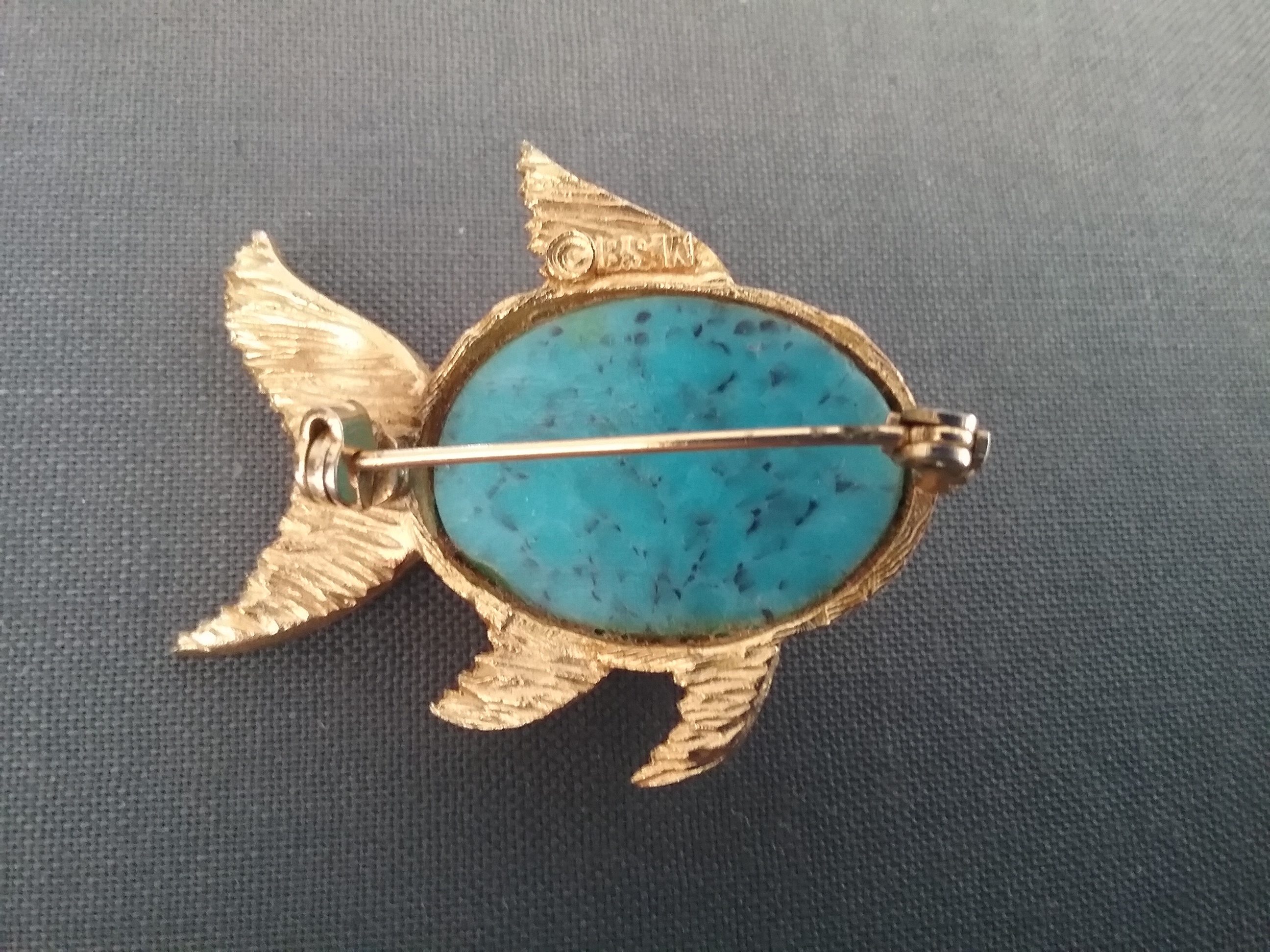 This 2"W goldtone fish brooch has a large faux turquoise body covered in a golden net with small white rhinestone accents & one red eye. By BSK ca the 1950s, marked on back