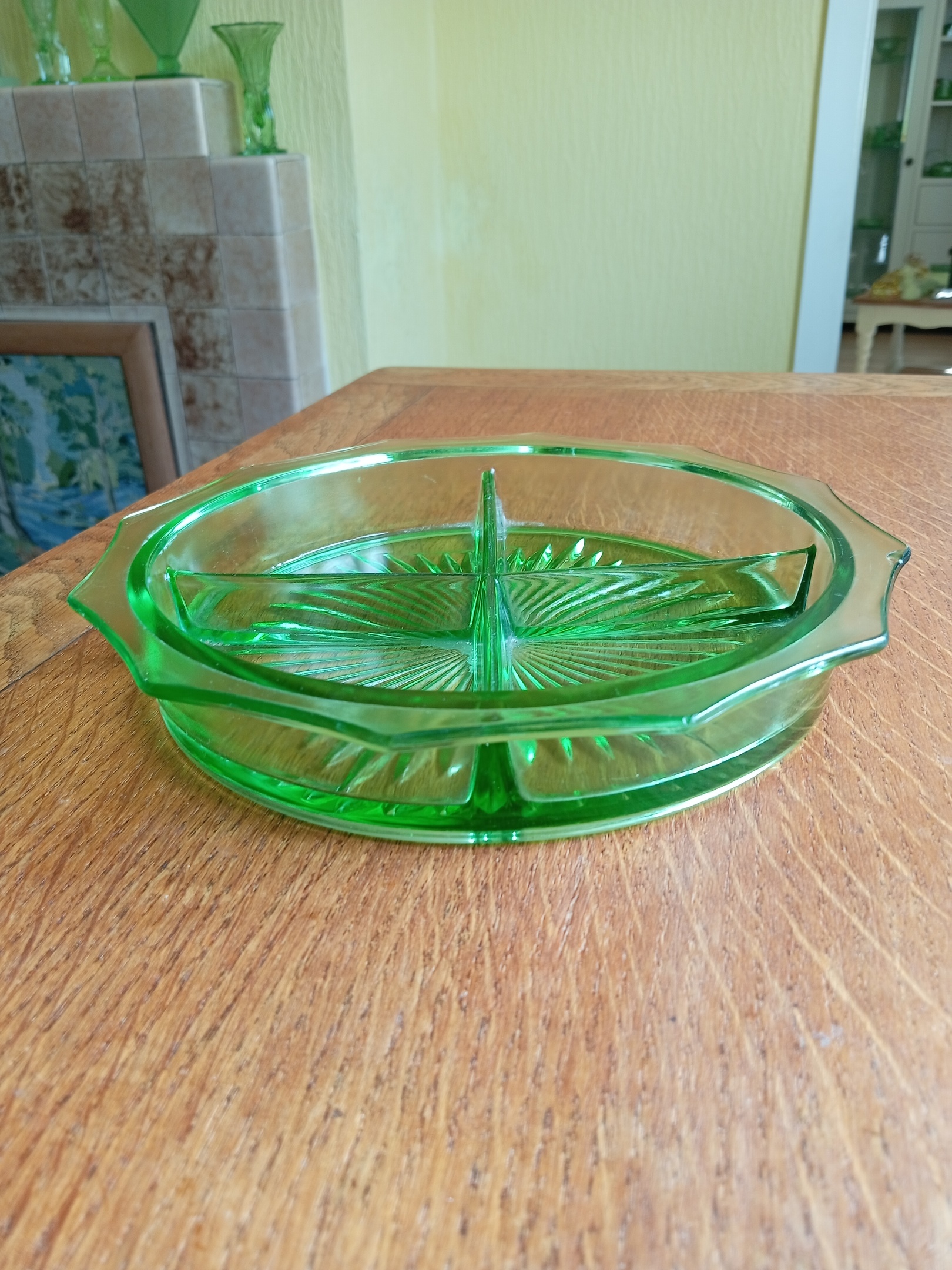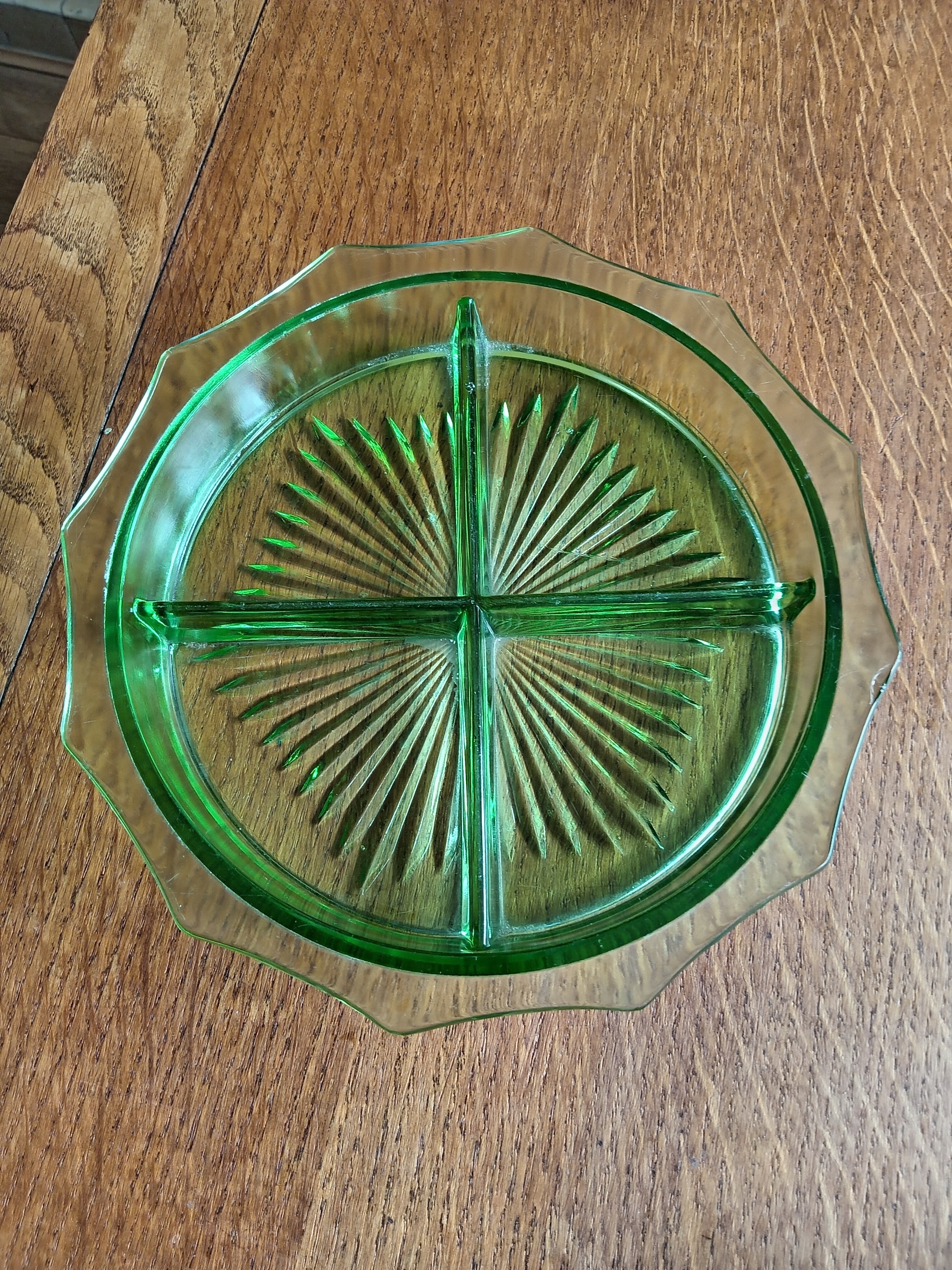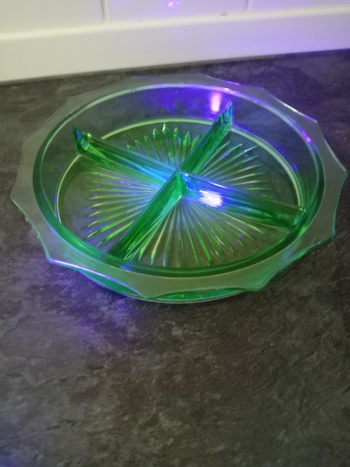 I assume this is American as there are a few of these for sale online in America, but none have an attribution. It is nine inches in diameter and glows through the thicker parts under 395nm. UV. I believe small amounts of uranium were used as a colour enhancer. Can anyone identify the maker please.