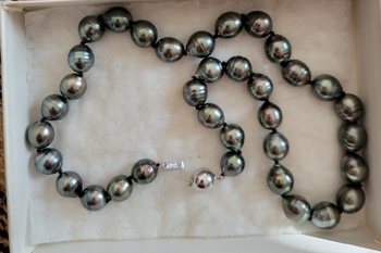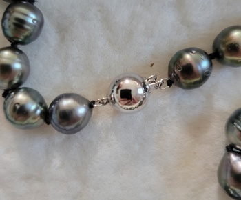 Natural black pearls necklace. Hallmark an A or a triangle 585. The internet give me few answers. One that the 585 is better then 14k, also the A could be for Russia or Australia. If you can identify the markings please let me know. Thanks