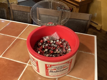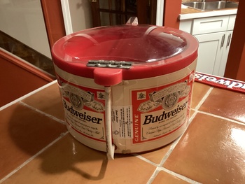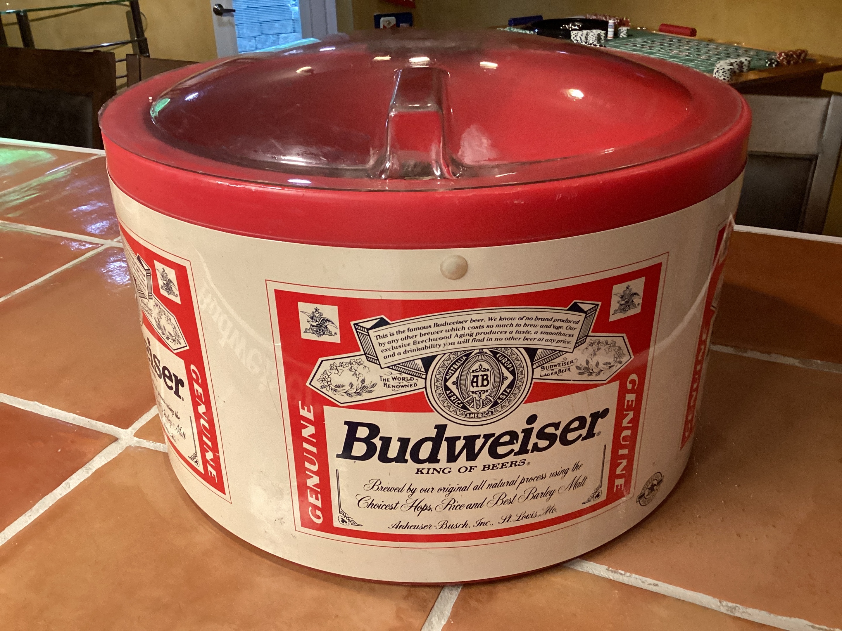Here is a cool vintage Budweiser cooler. Made by super cooler looks to me like it was from the 1980s. What’s amazing is the plexiglass hinged cover is still in very good shape and not broken which I’m sure most of these tops probably broke.