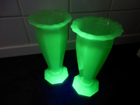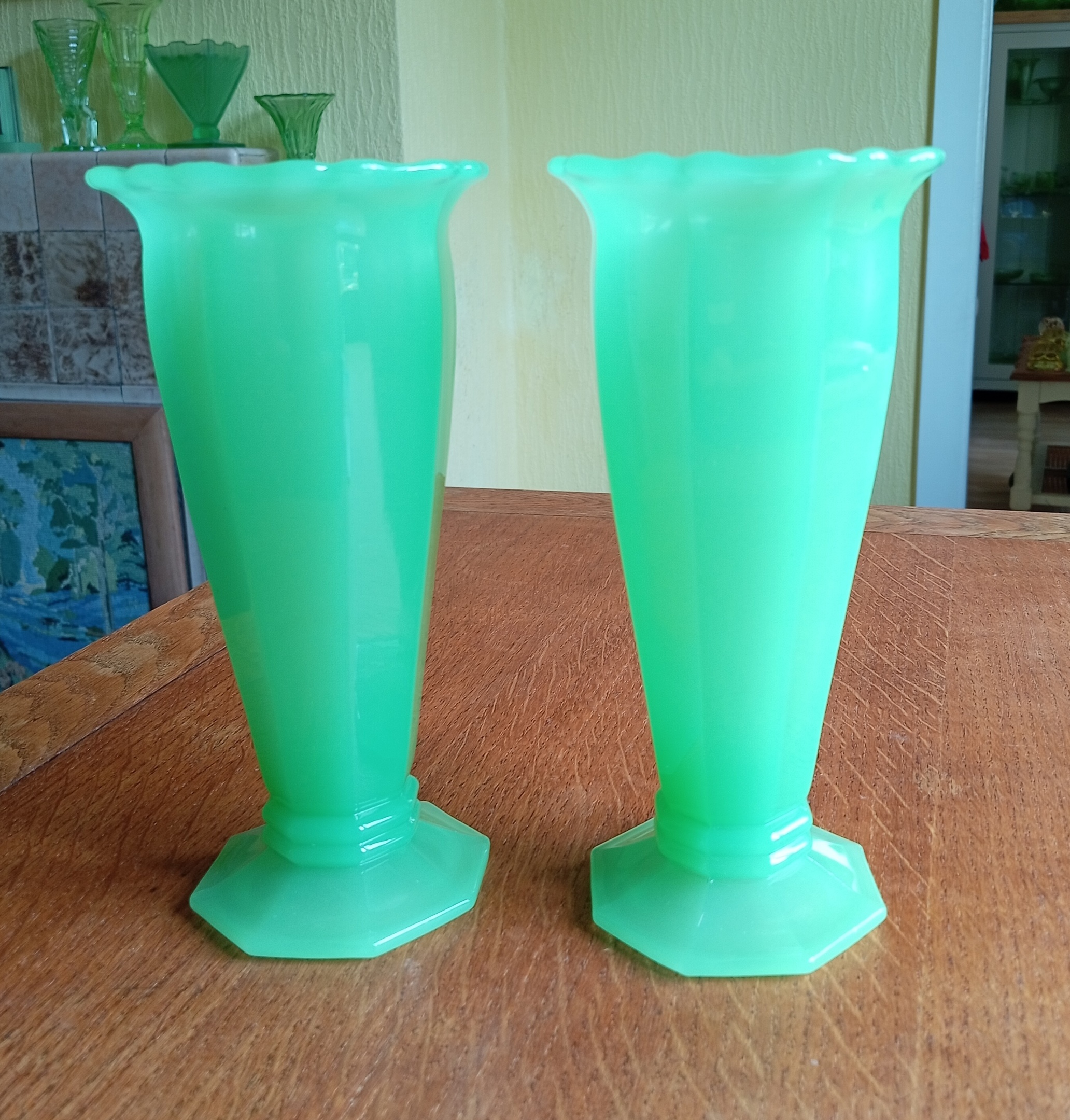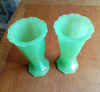 This is a pair of 4857 8" vases by Samuel Reich in uranium opaline/jadeite glass. Shown in their 1930 and 1934 catalogues.