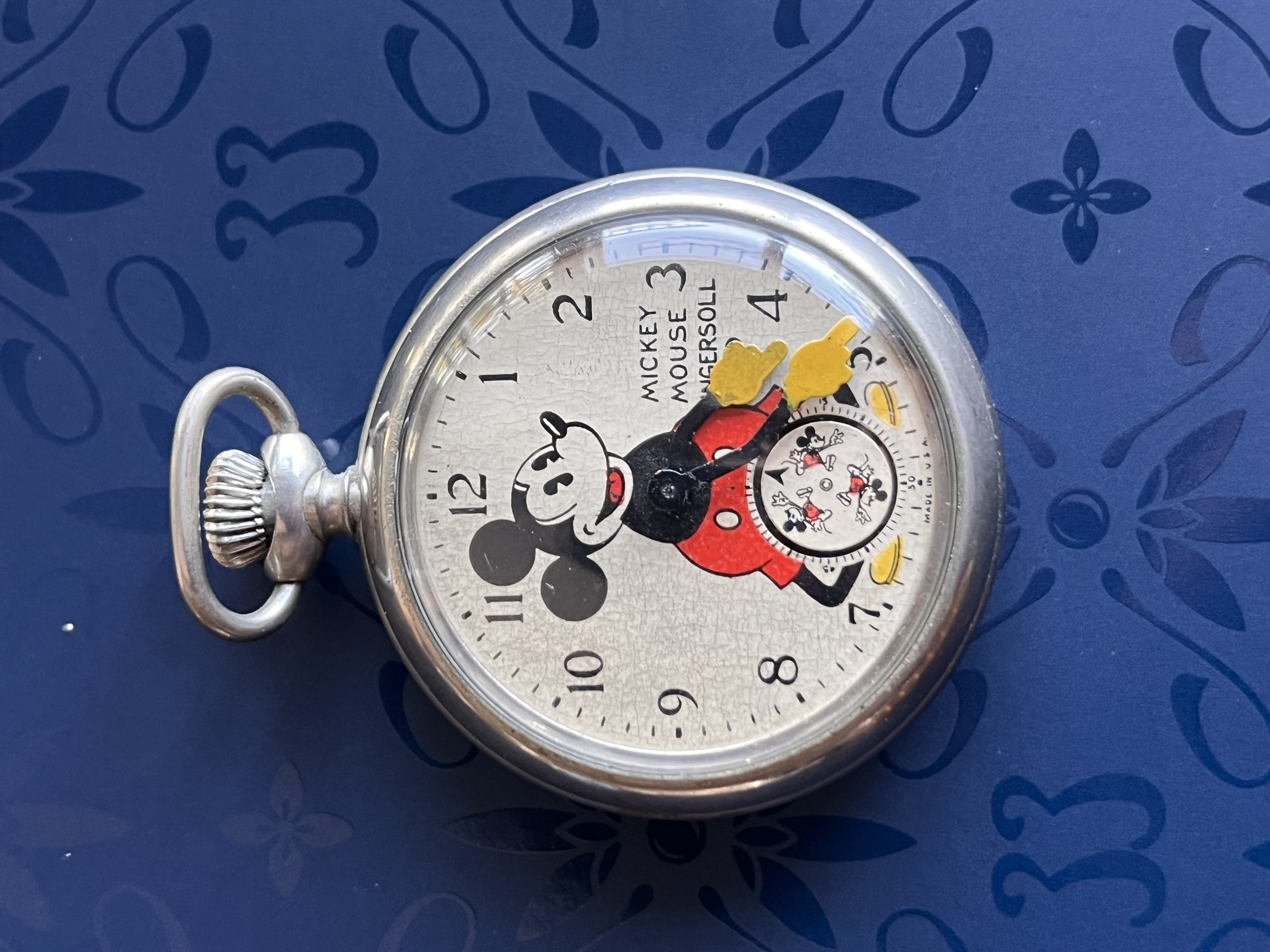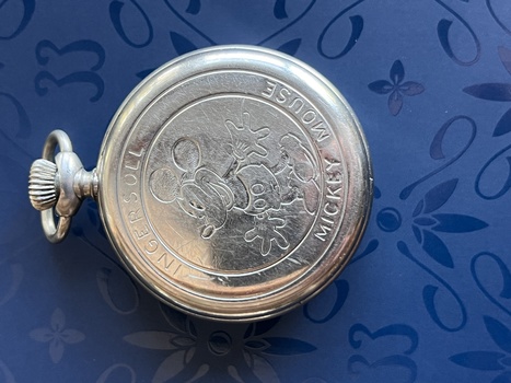 Ingersoll Mickey Mouse pocket watch. I think it’s the 1933 (or 34?) version. It still works, very loudly ticking away :) .