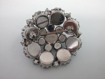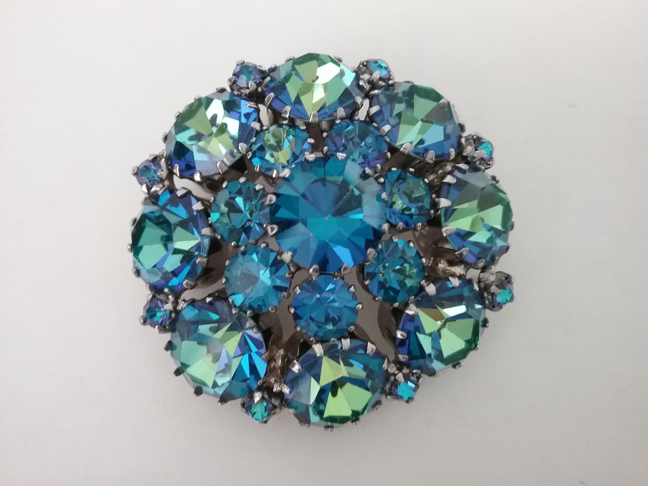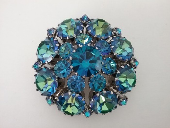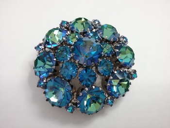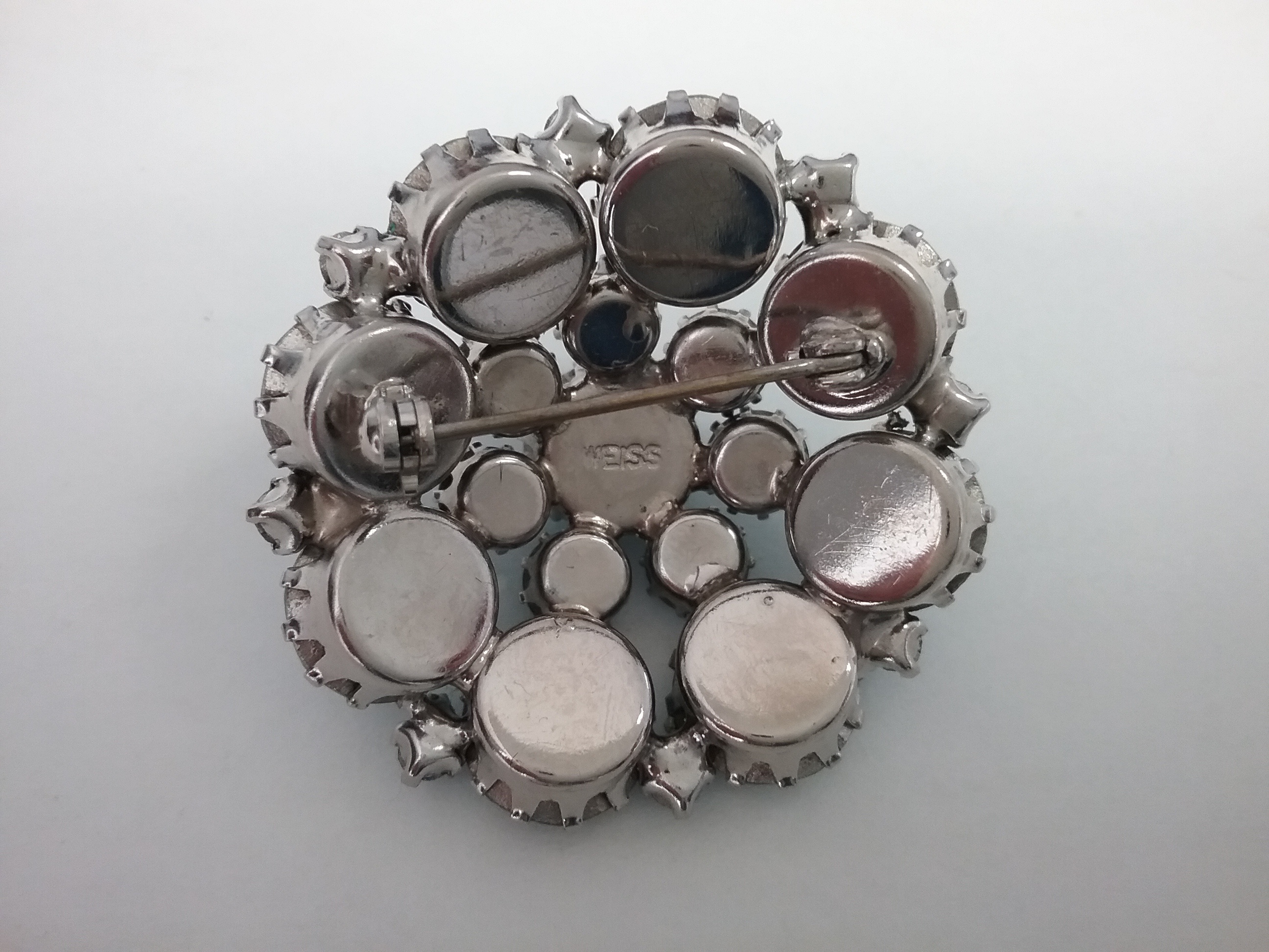 This 2" silvertone brooch has round rhinestones of different shape, the base color is blue, and while the central stone remains blue, the border stones have a green iridescence, very unusual for a 1950s brooch which is signed Weiss on the back