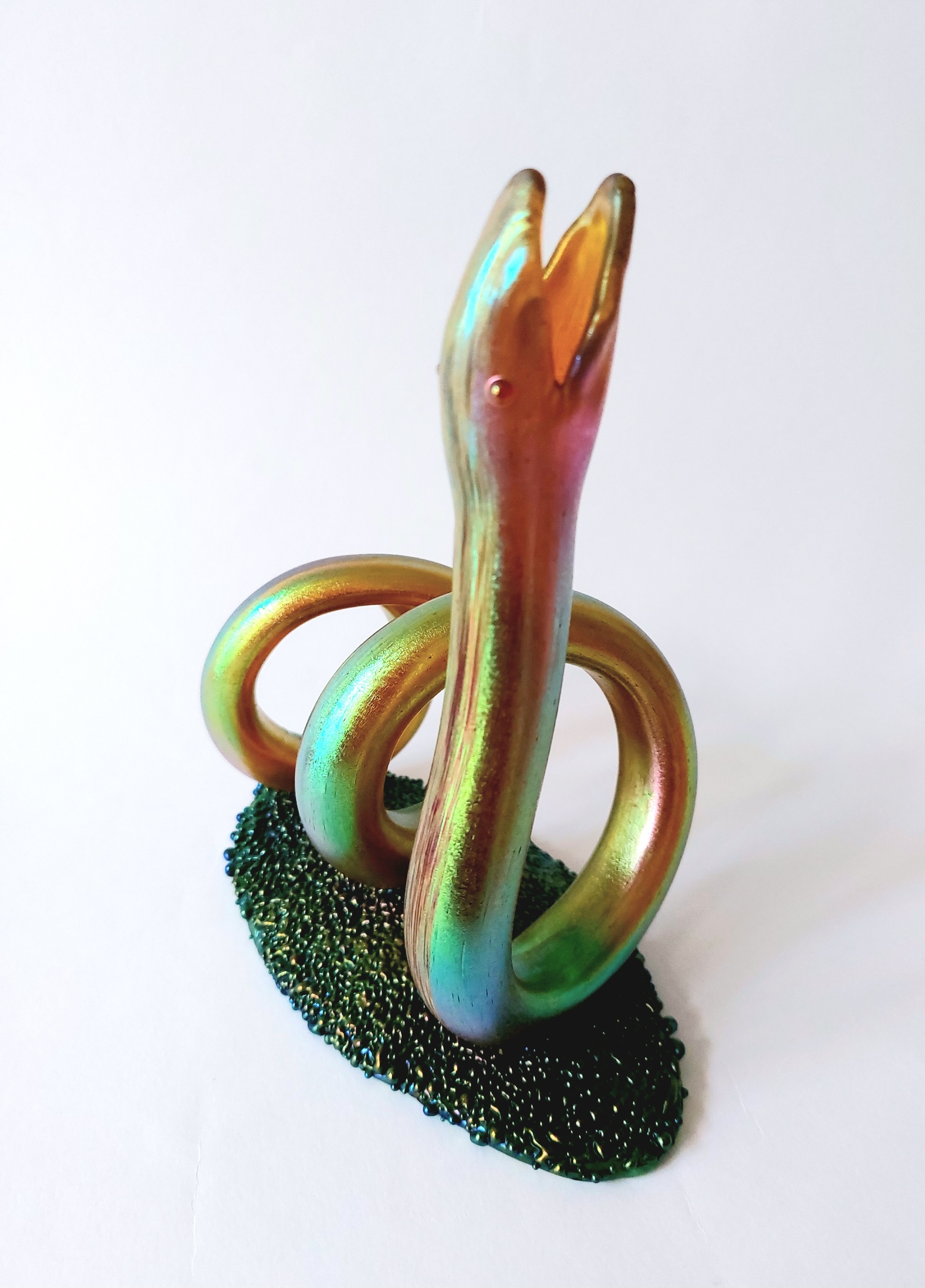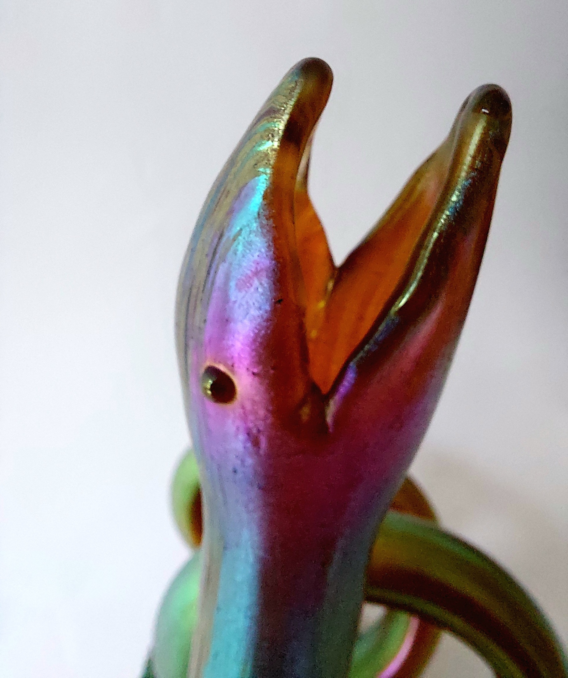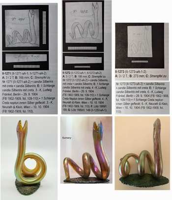 Entwurf: 1904, PN II 1272, Candia Silberiris mit Creta. Der Sockel wurde aus grünem Glas mit aufgeschmolzenen plastischen Körnern gestaltet. Darauf befindet sich der Körper der Schlange. Dieser wurde aus einem konischen, farblosen mit Silbergelbpulver und einem Streifen mit violetten Kröseln bestreuten Glasrohr frei als Spirale gearbeitet. Der Kopf wurde aufgetrieben und mit der Schere gestaltet. Ihr Maul wurde zu einem freundlichen Lächeln geformt. Anschließend wurden noch die Augen in Rot aufgeschmolzen, das Ganze dann reduziert und irisiert. Höhe 18,5 cm.