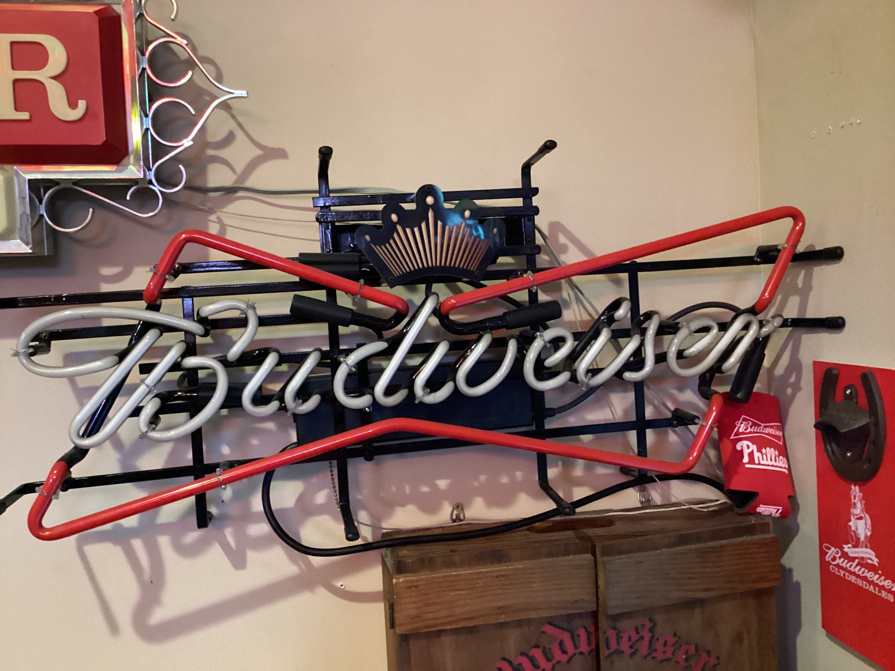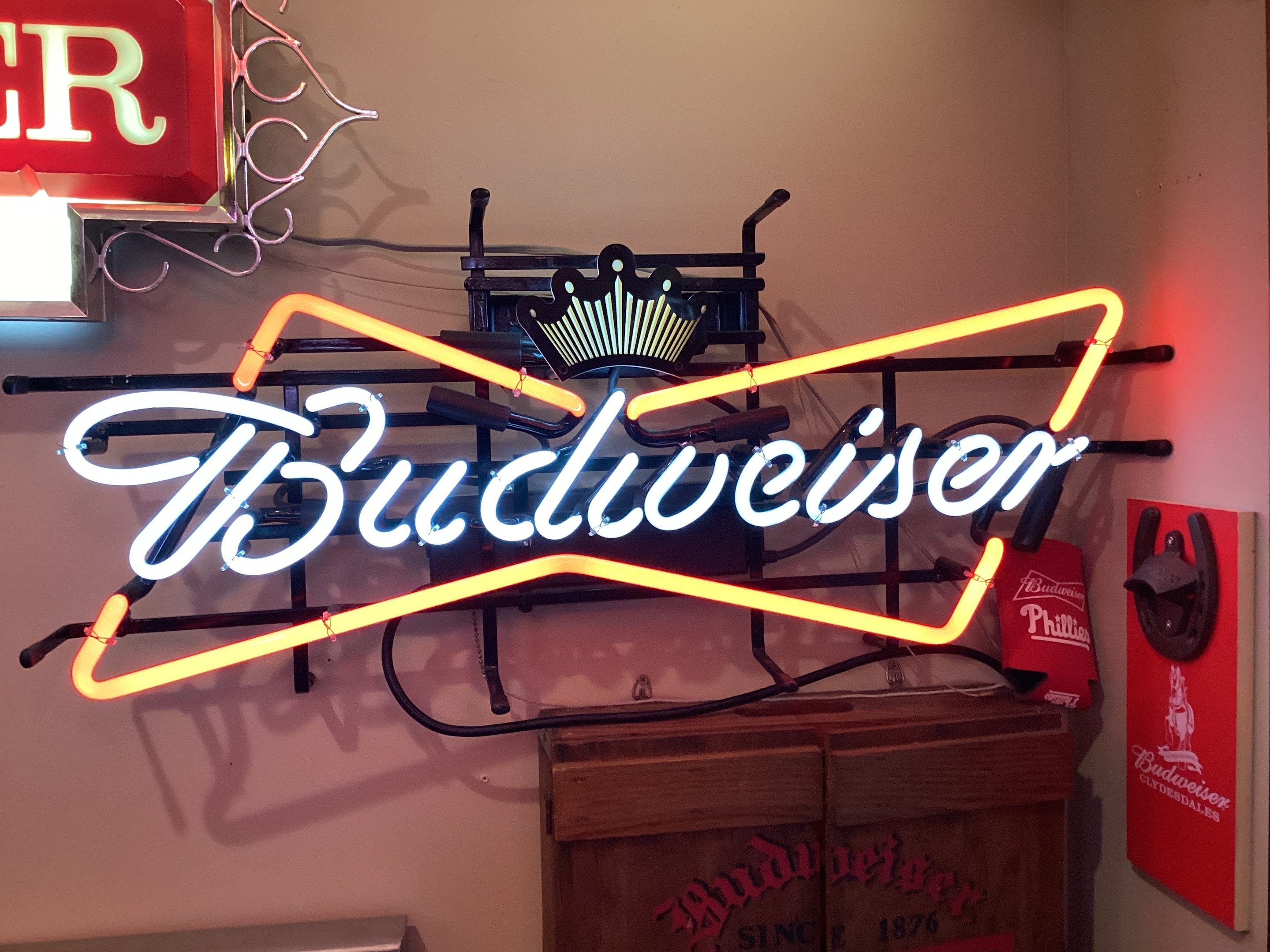 Here I have a Budweiser neon sign. These were made in the 2000s. This is when the king of beers was showing a crown on the top of their signs.