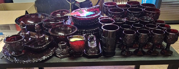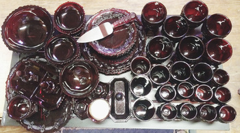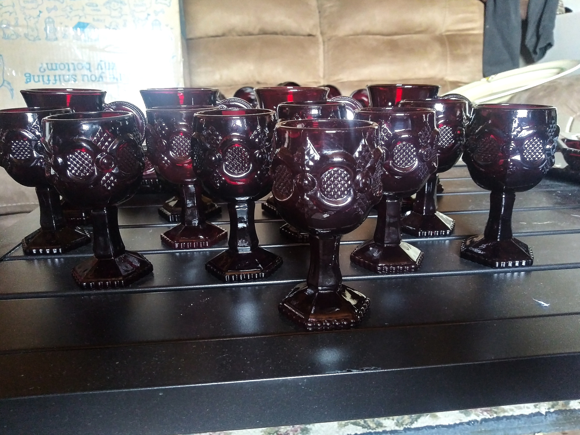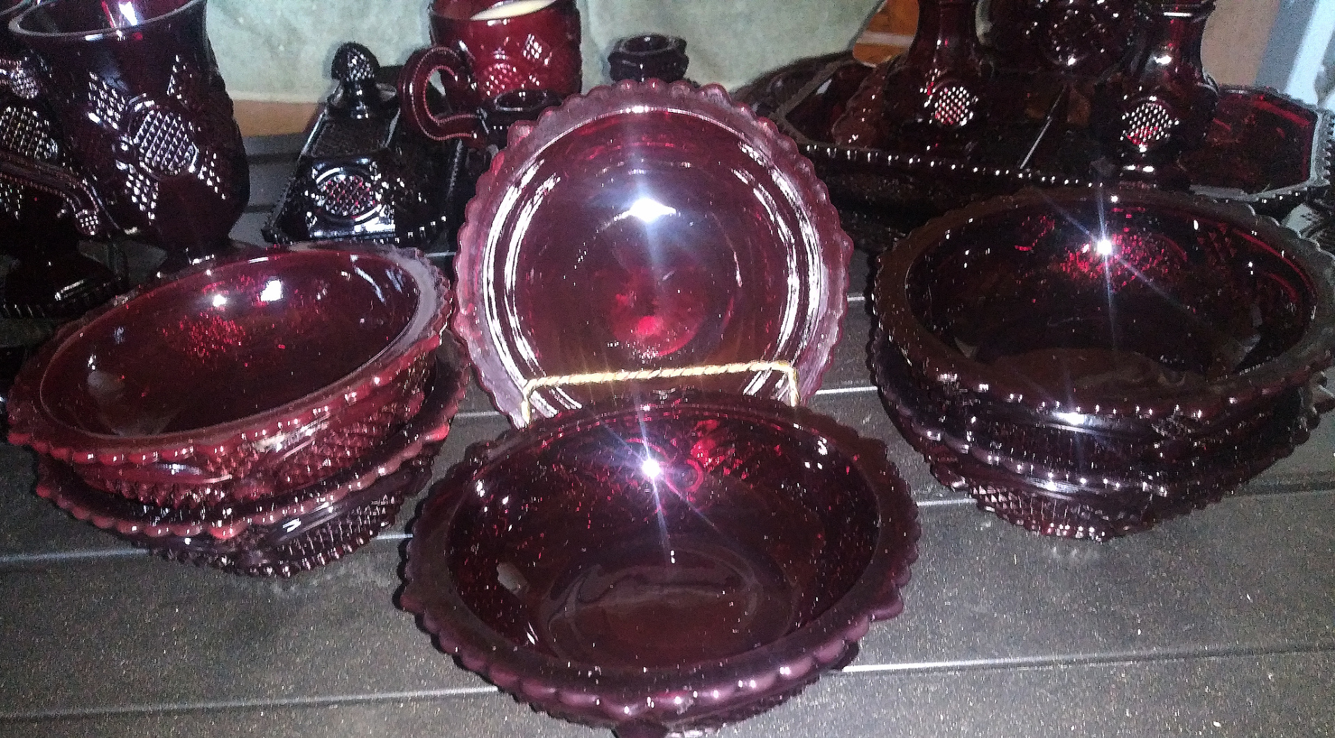 This is my cherished vintage Avon 1876 Cape Cod Glass Collection in Ruby Red ( they also had a set in blue) passed down to me by my Grandmother-In-Law who has since passed. She was so special and this will forever keep her in the hearts of my hubby and me.