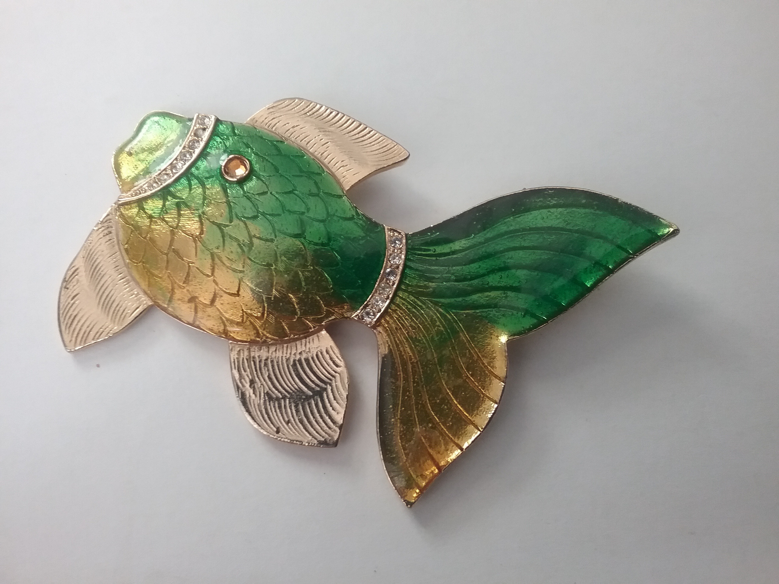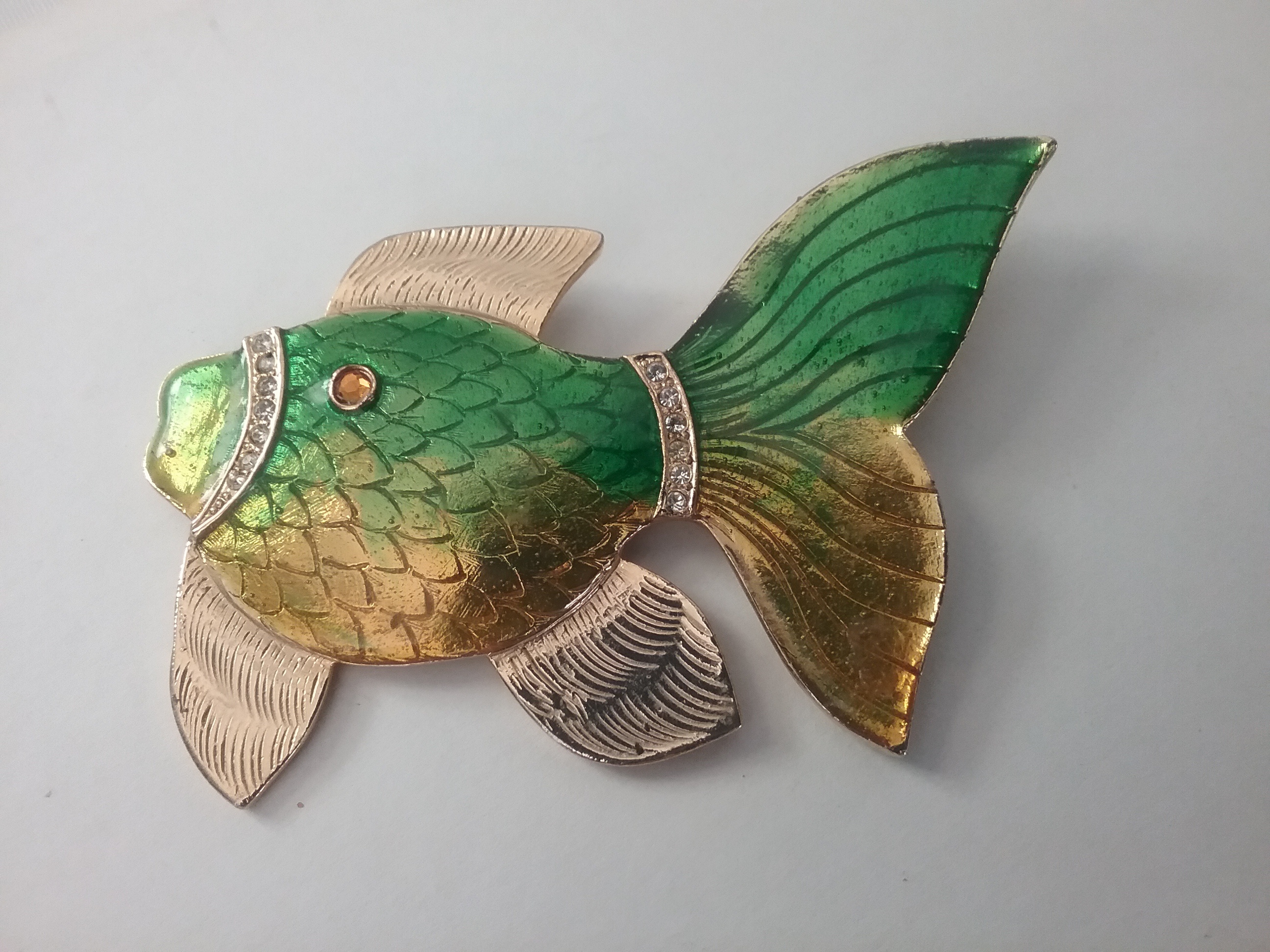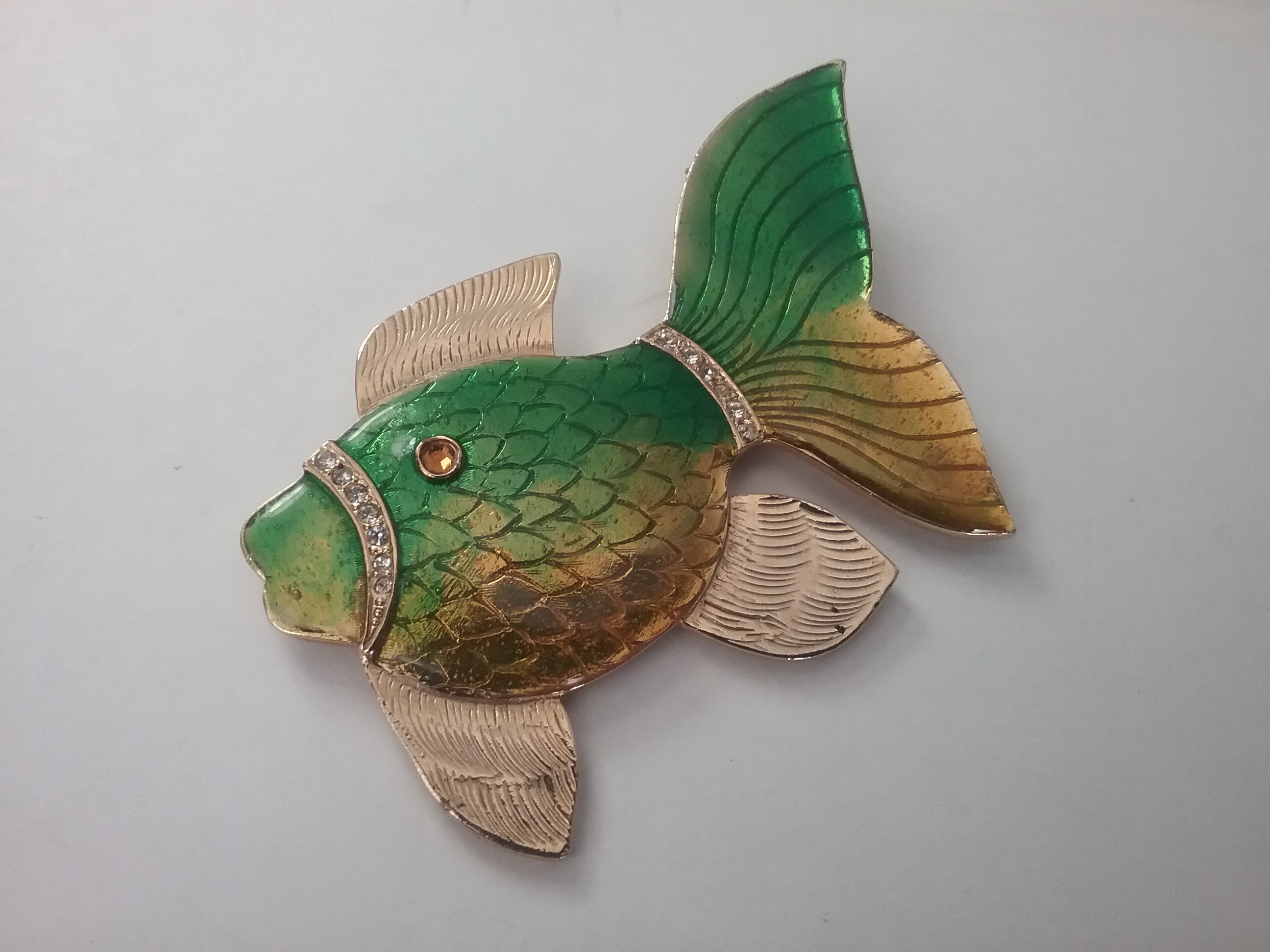 This 3"W goldtone fish brooch has bright green & gold enamel, with white rhinestone accents and one amber eye. By Gem-Craft of Providence RI ca the 1970s, with their craft in oval mark on the back