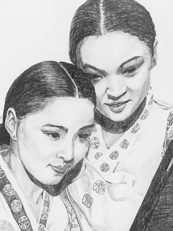 The two ladies are wearing Korean traditional clothes. At least that is a start