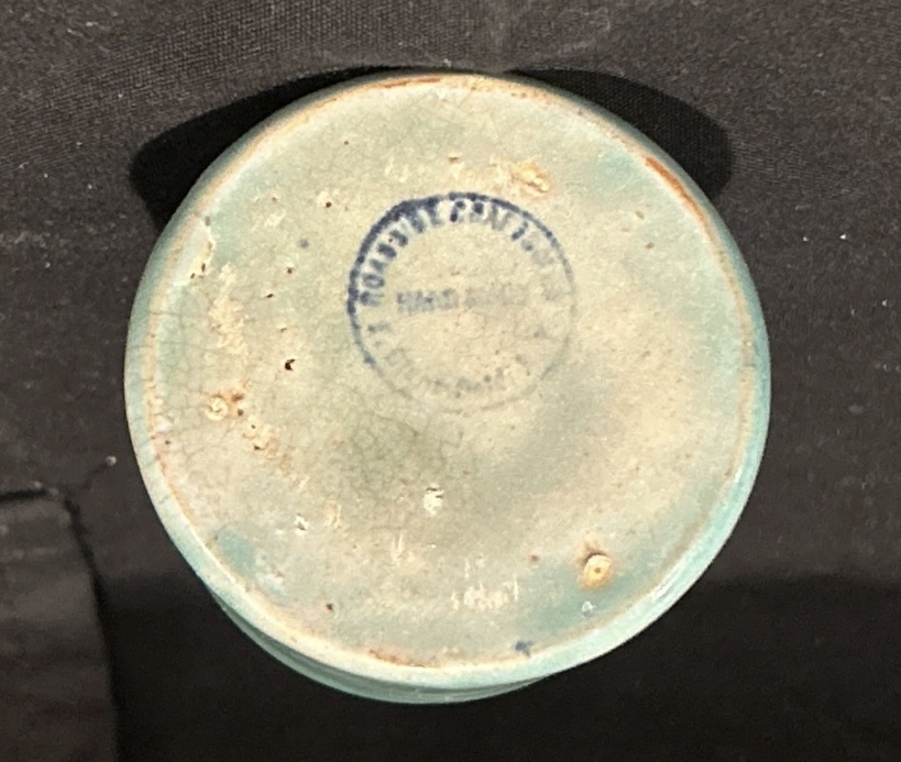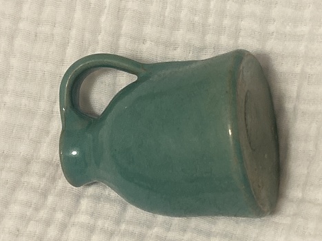Miniature pottery jug. Beautiful blue green glaze. Can not read mark except hand made in the center. Does anyone recognize the mark, or able to read? Thanks for your help