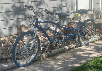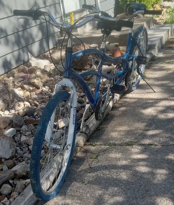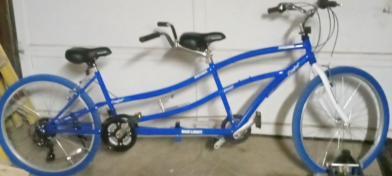 After searching 18 months for a decent two persons bike I finally found this blue beauty on Craigslist. It was out of our price range but my husband spoils me so we made the trip to St. Louis, brought her home, and got it assembled. My kids, the neighborhood kids, friends, family, my husband and I have all taken turns riding "Bluey"! Its been over a year ago since we first brought her home and let me tell ya something- we literally rode the wheels off! Now she needs new tires and I can't find blue wall tires anywhere!