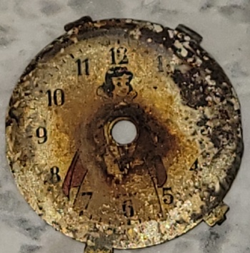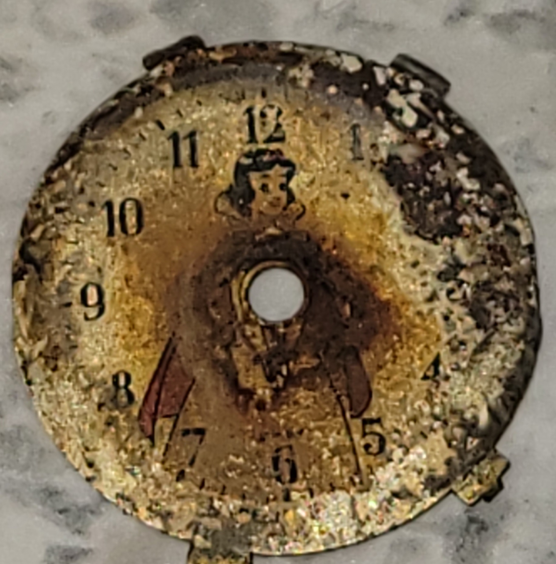 Vintage watch dial from 1950. Snow White on the front. Discolored and aged but still a neat item from back in the 1950's.