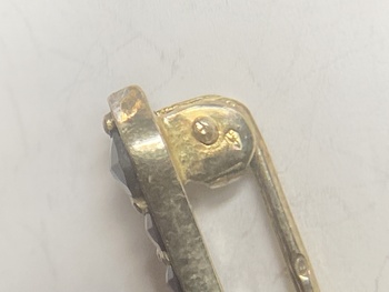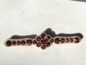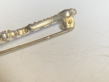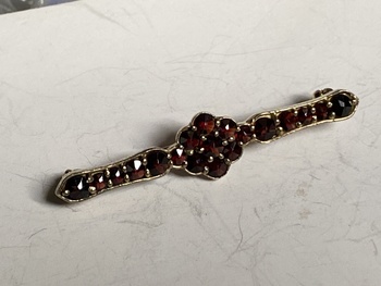 Hello I’ve just rediscovered this Brooch, it looks like it’s garnets , I’ve just noticed 2 marks, very tiny, one on the pin & one on the hinge, never seen those before. I wonder if anyone can tell more.no idea how old it is or where it’s from