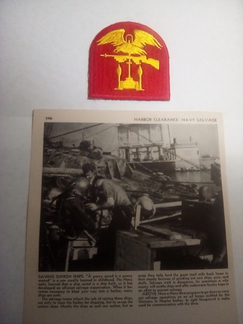 Eagle perched on rifle, red, US Navy amphibious forces insignia authorized in June 1944. Original photo of Navy divers doing ship salvage