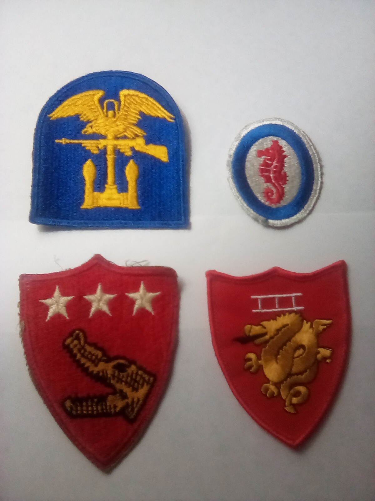 2nd row, US Marines, crocodile with three stars on red, US Marine Corps 3rd division active 1943-1946; snake, gold III on red, US Marine amphibious unit active1942-1946