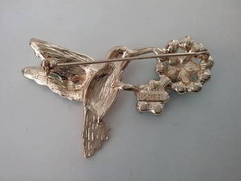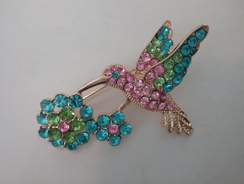This 2 1-2"W goldtone brooch has a pink rhinestone hummingbird with aqua/lt green wings atop a pair of flowers of various pastel small stones. By Monet with mark on the back ca 1980s