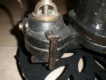 Sometimes litter, tadpoles, or stones would be caught in the inner workings of the ram pump, and it would stop the action. Then the pump would then need disassembly in the shop to remove the obstruction. Not with the Gawthrop Ram. Photo #3 shows that the entire ram is held together with a series of wedges. A small rock can be used to disassemble the ram right at the stream and the obstruction can be easily removed. After a simple reassembly, using the same rock, and the ram can continue pumping.