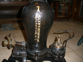 This is a John Gawthrop No.1 hydraulic ram. Often called a water ram. To simplify its use, it pumps water flowing from upstream to a lower point downstream while pumping a percentage of this water flow to a much higher point using only the power of falling water. A more concise description of its use and how it works, can be found on the internet. Look up hydraulic water ram.