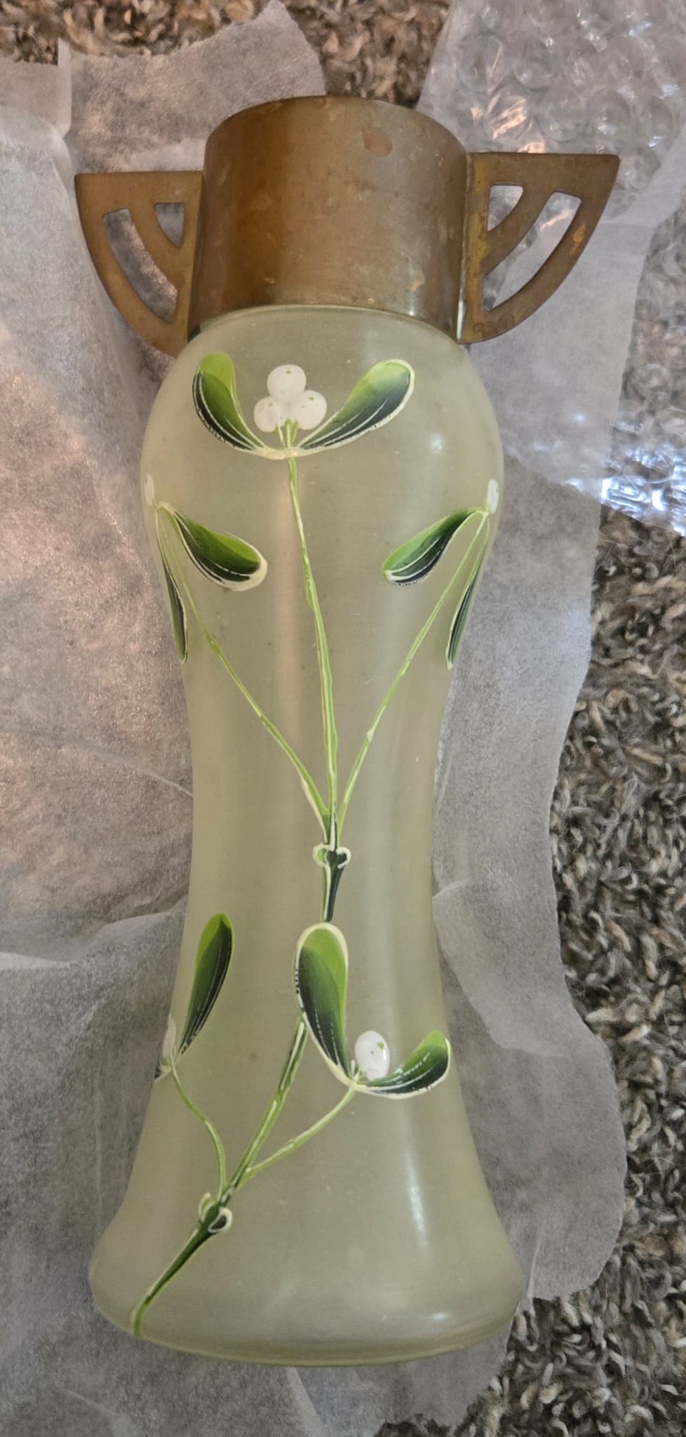 If I judge the vase by its painted decor, based on the Mad for Glass example, my vase would be made by Fritz Heckert. If on the other hand I focus on the metal frame, it could be made by Loetz. Then again however, I checked for similar decors at Loetz.com and couldn't find any. Did I miss something? Is it Loetz + Kolo Moser? Fritz Heckert? Or is it maybe a collaboration of Fritz Heckert and (the School of) Kolo Moser? Would love to hear your ideas!