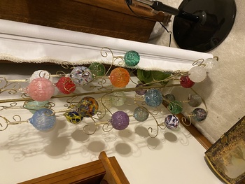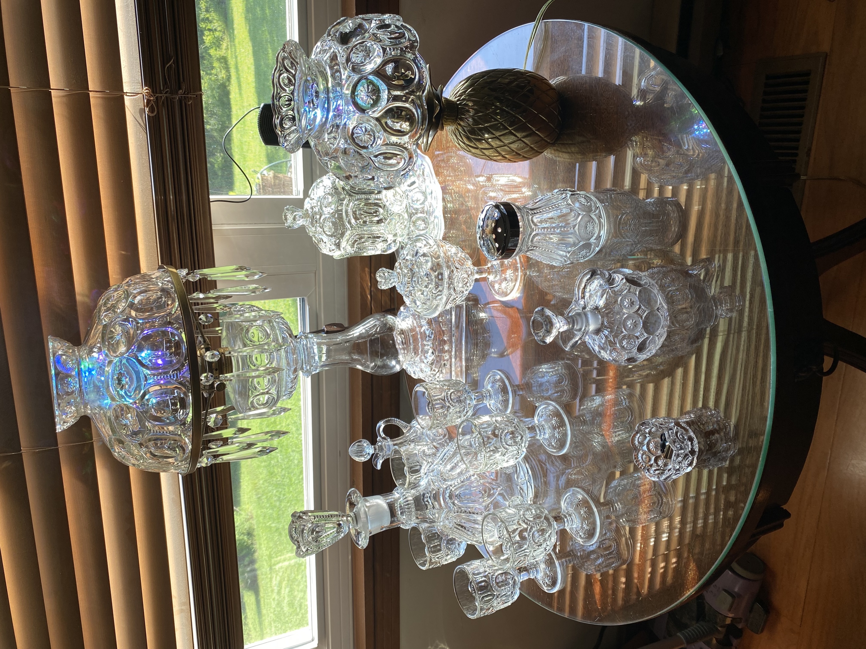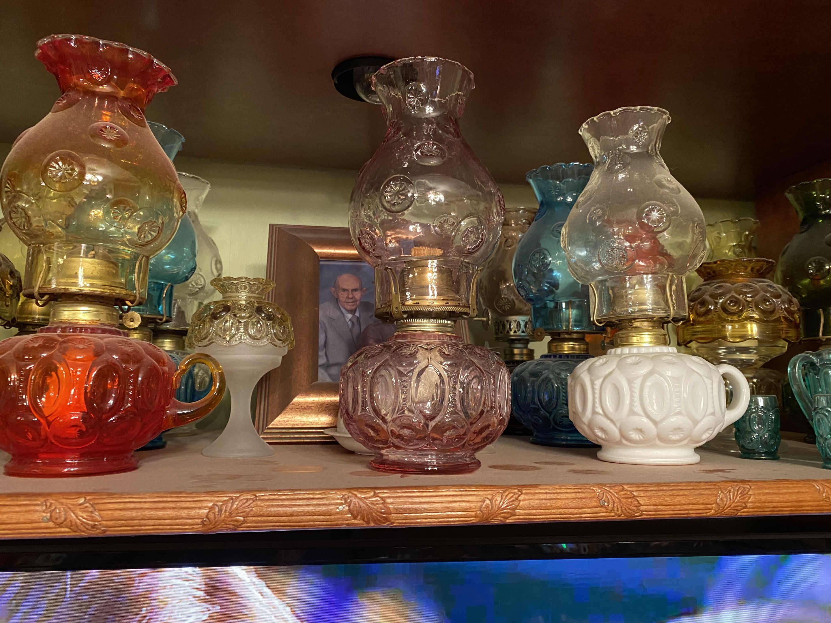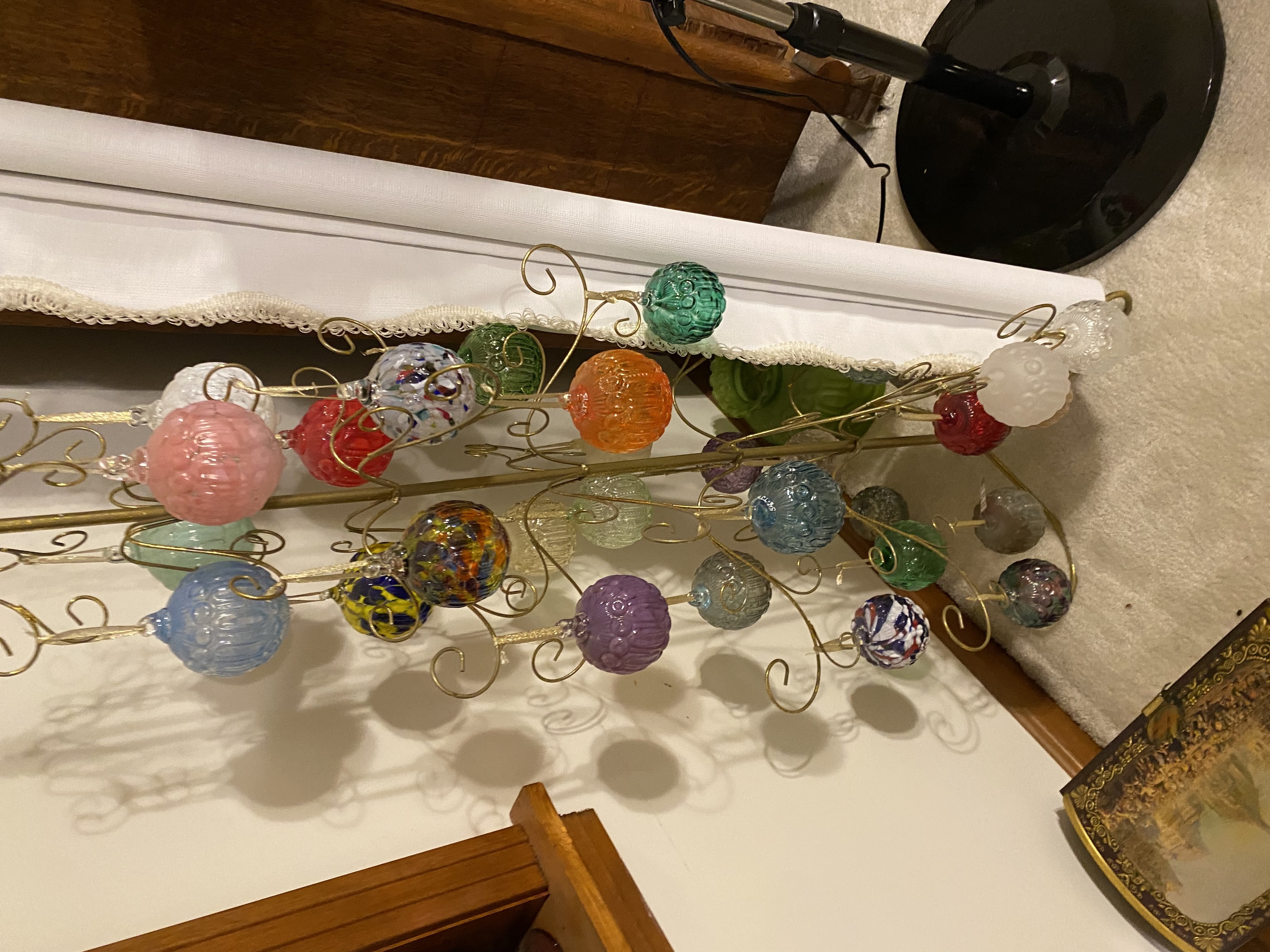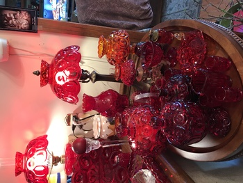 Our Crystal Table. Our 12” Oil Lamp collection, featuring a very rare pink oil, one of only 3 made. A table of Ruby. Then our M&S ornament collection. We have every one of the round ornaments made so far.