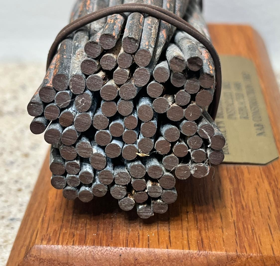 A historical fragment of vertical suspender cable from the Brooklyn Bridge, dating to its completion in 1883, forever preserved on a wooden display stand.