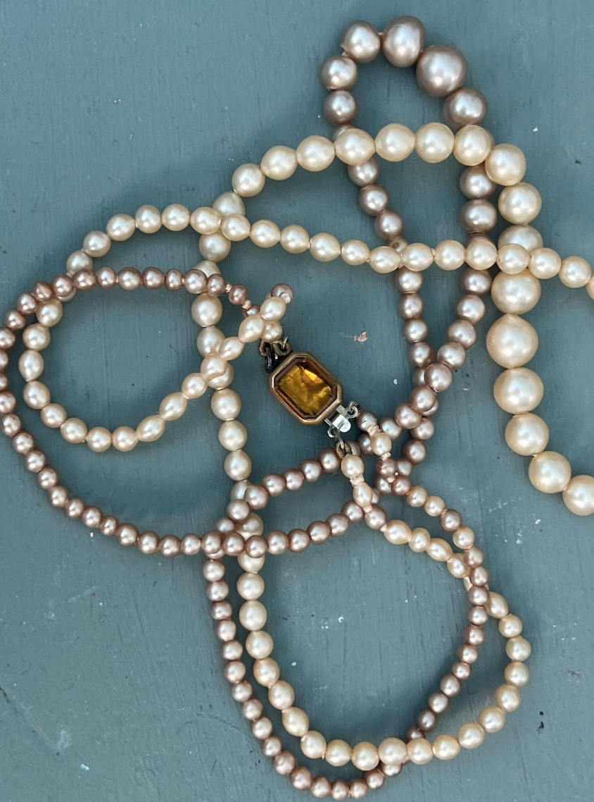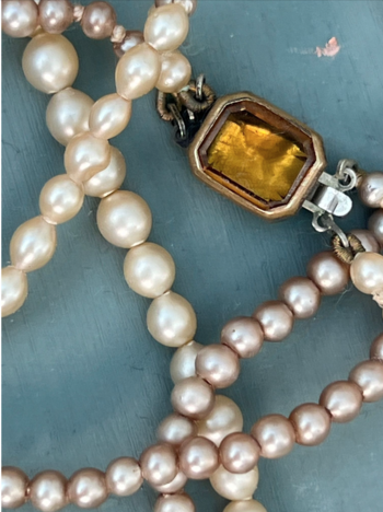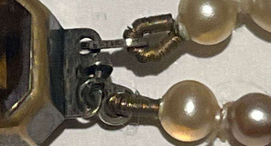 Very pretty double strand pearl necklace, off colour, but very interested in the twinning on the clasp see photo 4, is this possibly Georgian? Any experts who know about pearls, no visible markings or hall mark - thank you p