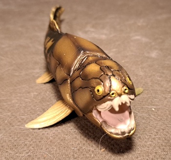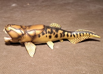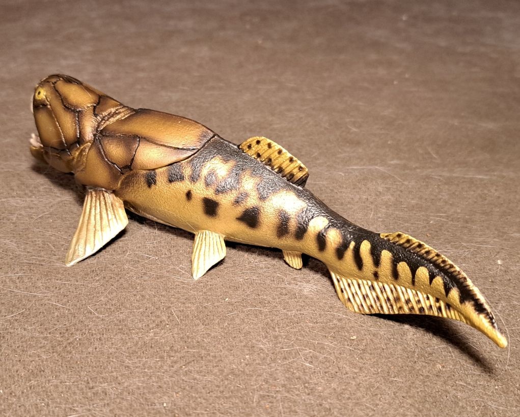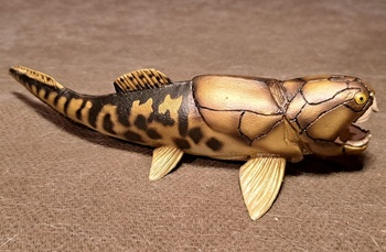 This is an ancient fish that lived about 375 million years ago is the Devonian age. The Devonian Age was known as the age of fishes. This one is distinctive for its bonny head and large size. Plus a powerful jaw and teeth. Size on these ranges from 13 feet to 28 feet. It gets a bit confusing but 18 feet seems to be the usual size. The figure here shows the bony head with either little or no skin on the head but some think the head was covered with skin. But then again most fish did not have bones, they have Cartledge which dies not fossilize.