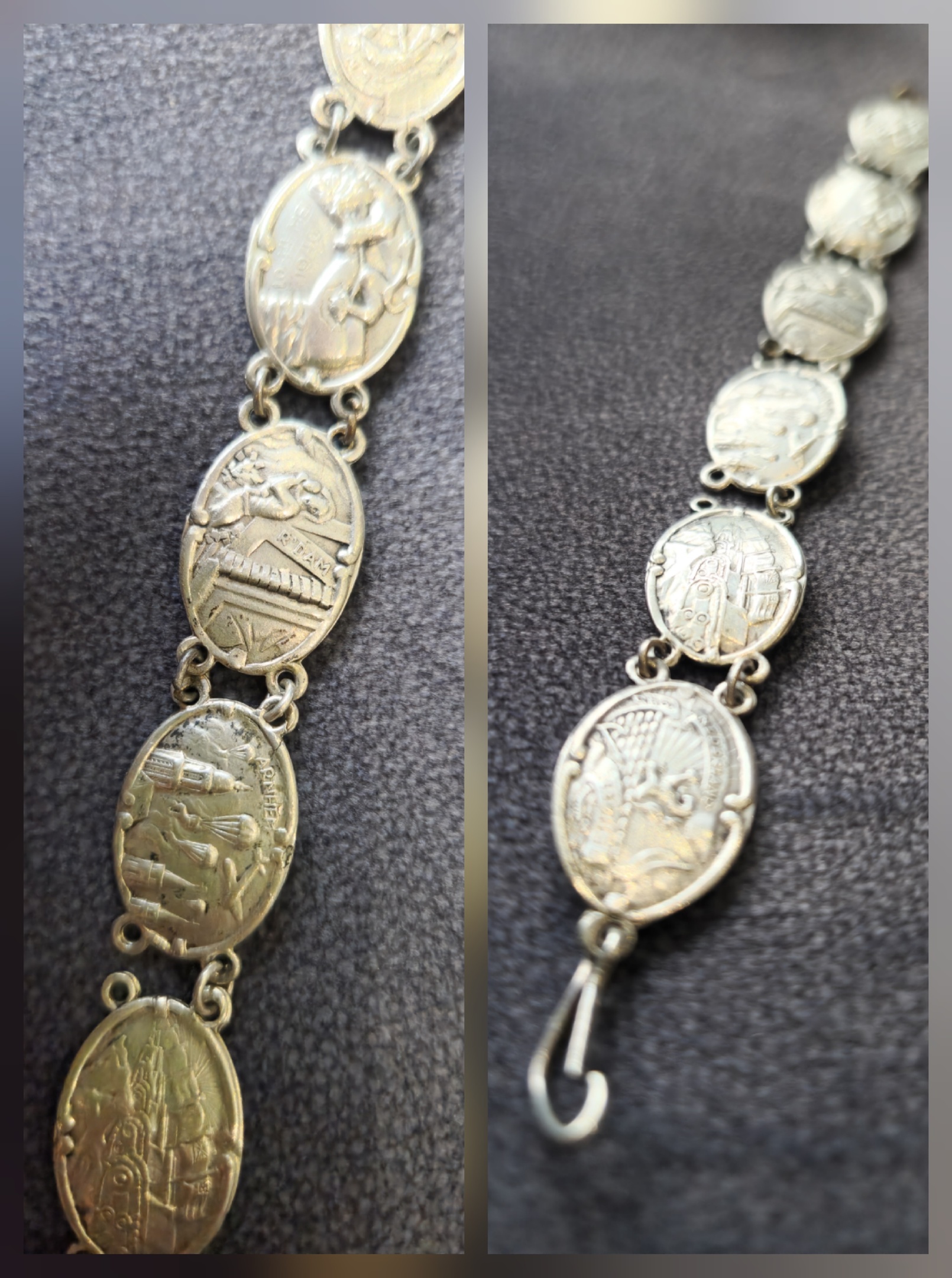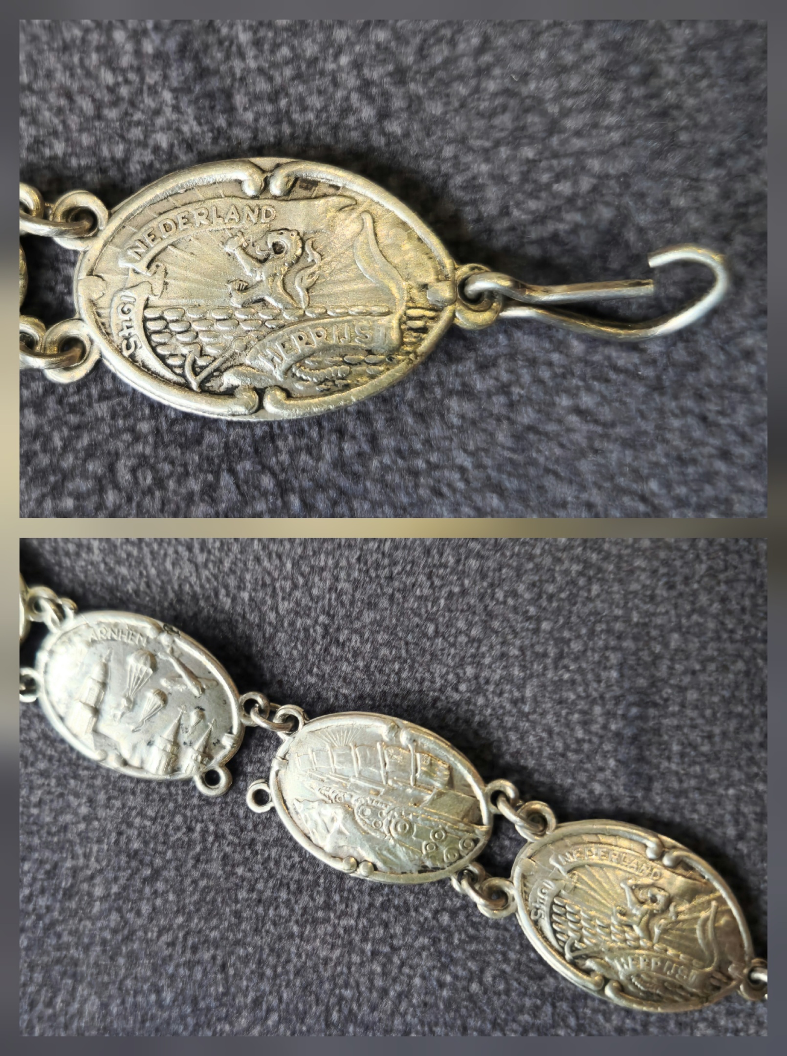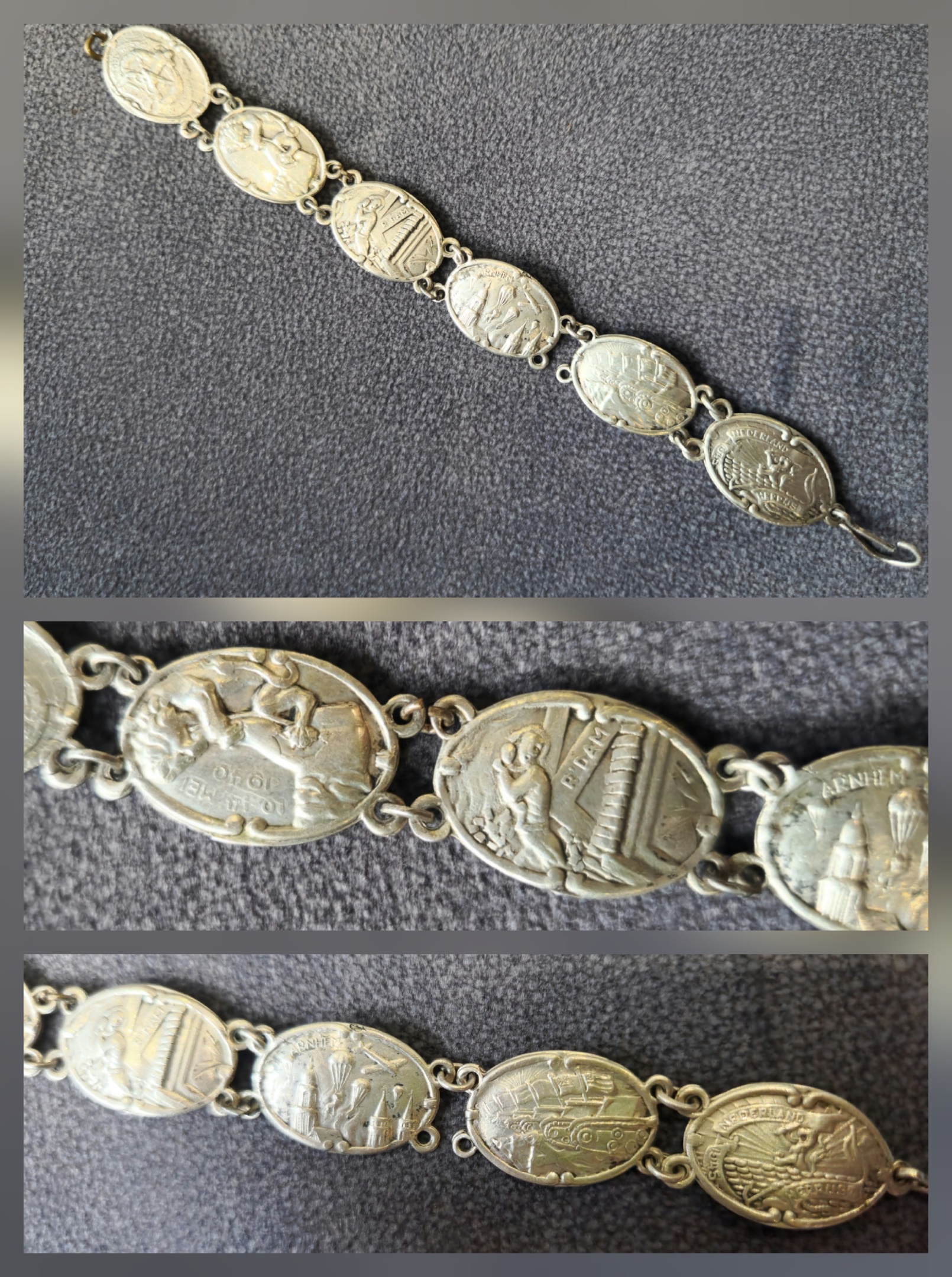 It's a Dutch bracelet. The text on the bracelet reads "Nederland Herrijst 1945" (The Netherlands Rises 1945). Some bracelet links also feature images of commemorating places or events of significance during World War II, such as Arnhem and Rotterdam. Some parts are also illegible due to wear or blurry photos.