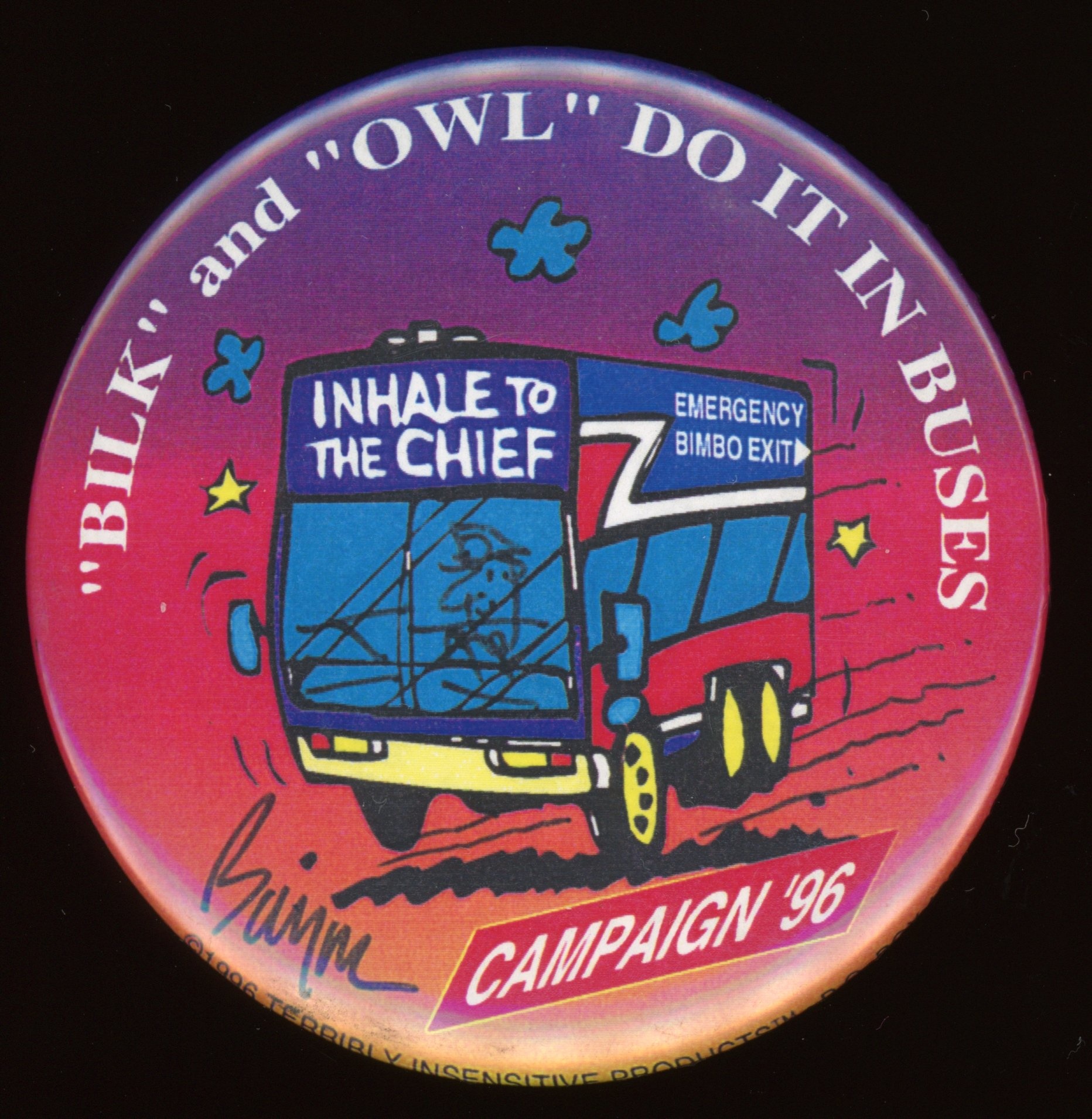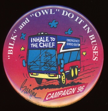 Here's a very specific anti-satirical pin relating to Bill Clinton and Al Gore. At the time there were controversies relating to Bill and Al's use of marijuana at the time, and Bill's association with affairs. Of course their bus was also iconic, so this pin seems to combine all of these factors together with the artist's reoccurring nicknames he uses for Bill and Al, BILL K and OWL.