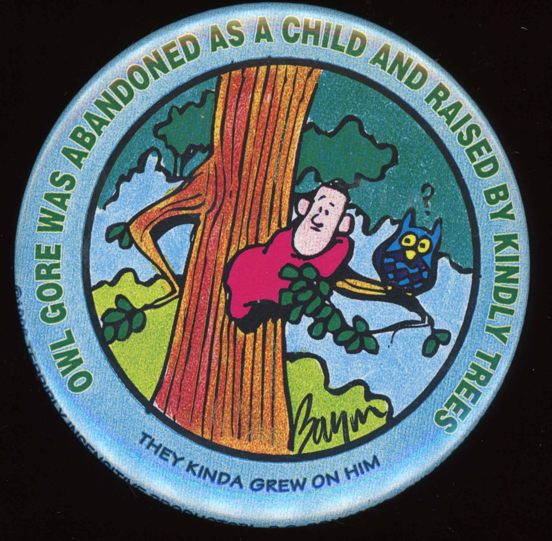 About the artist: Jim Bayne is an American political cartoonist best known for his satirical pinback buttons produced during the 1990s. Working under the imprint Michigrin (a tongue-in-cheek nod to “Michigan grin”) as well as in collaboration with the provocatively named Terribly Insensitive Products, Bayne created a distinctive body of political pins that mixed caricature with humor.