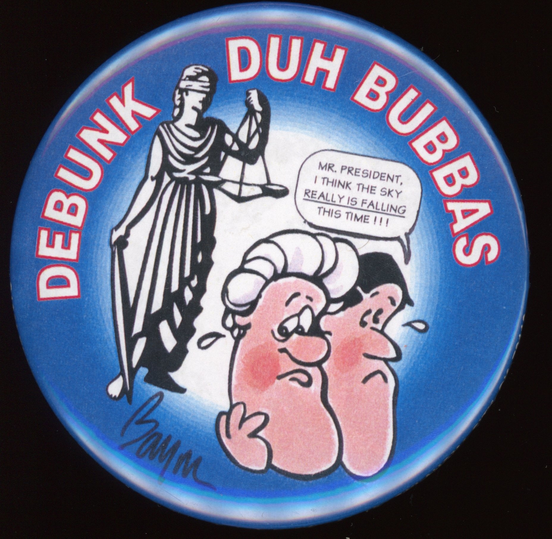 About the artist: Jim Bayne is an American political cartoonist best known for his satirical pinback buttons produced during the 1990s. Working under the imprint Michigrin (a tongue-in-cheek nod to “Michigan grin”) as well as in collaboration with the provocatively named Terribly Insensitive Products, Bayne created a distinctive body of political pins that mixed caricature with humor.