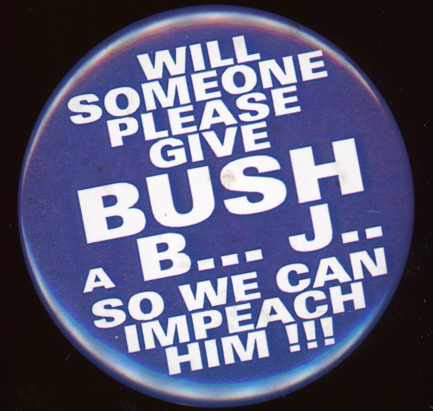 A comedic anti Dubya pin referencing the Monica Lewinsky scandal that led to Bill Clinton's impeachment situation.