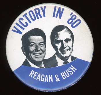 This simple pin was for the Reagan-Bush Campaign in 1980. Its design reminds me of older mid-century designs.